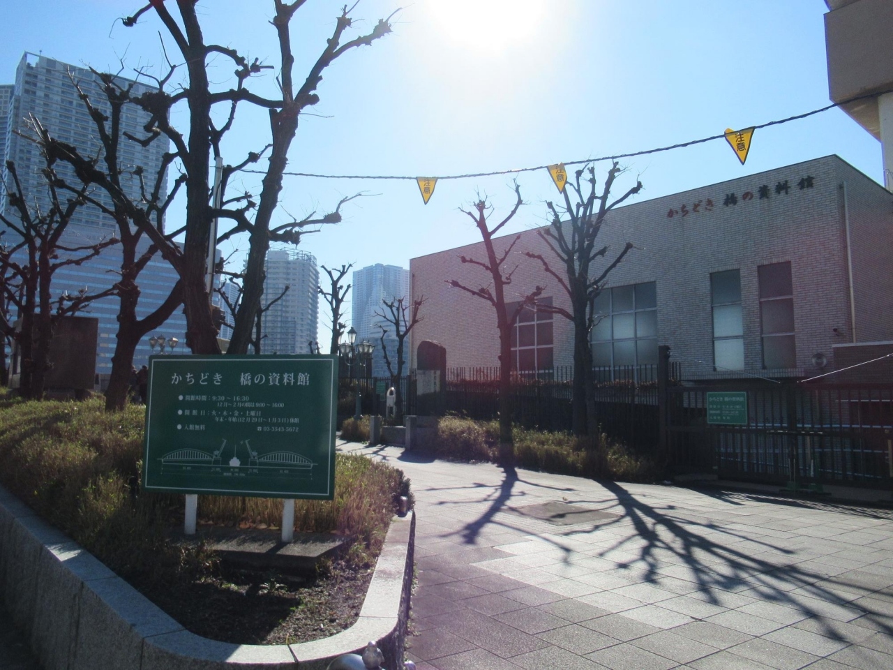 - 地下鉄・築地駅出入口1から左手(晴海通り)方向の築地四丁目交差点を渡り左折して6分弱進んだところが勝鬨橋の南西詰なので歩いて7分半位です