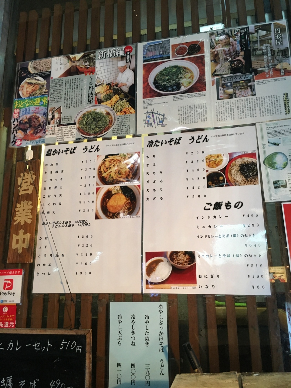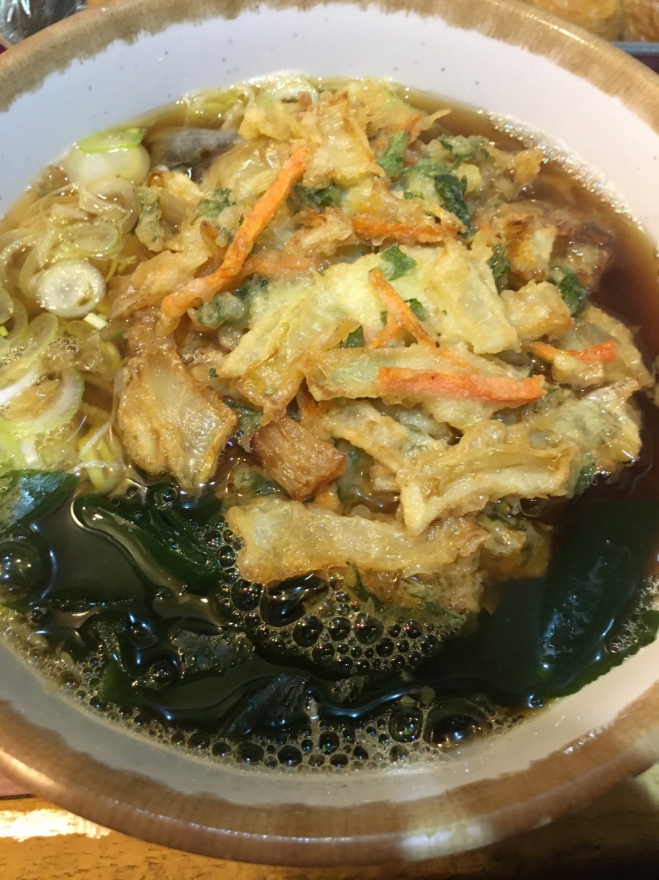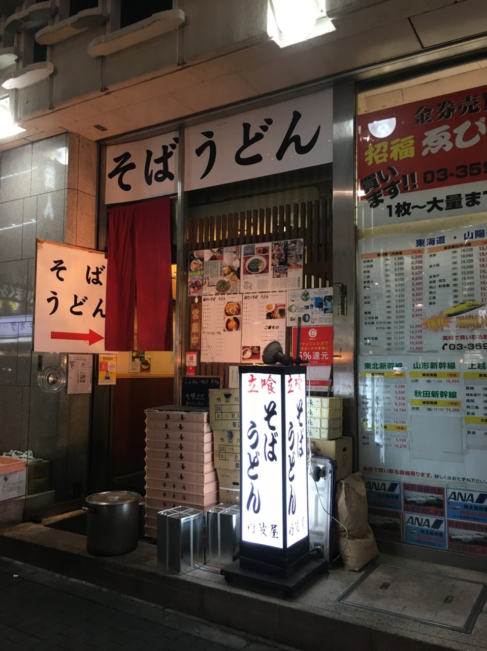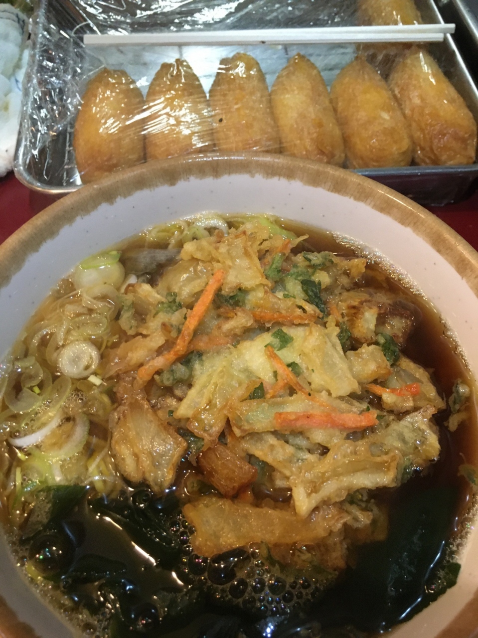 カウンターのみの立ち食いの店で7~8人ぐらいしか入れない狭い店。かき揚げそばを注文。料理と引き換えに現金を支払います。そばは少し伸びたような素麺のようなそばでした。かき揚げは具が結構入っていて、ツユに染み込みました。