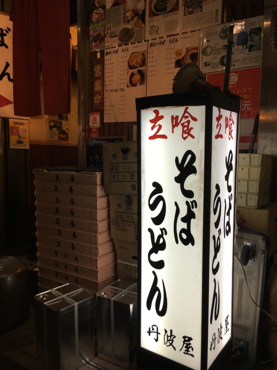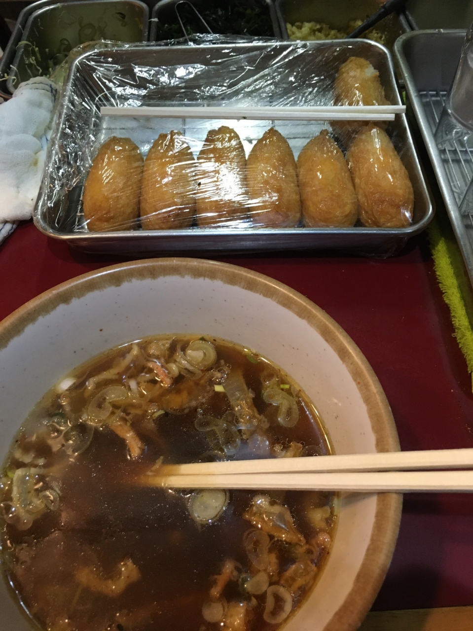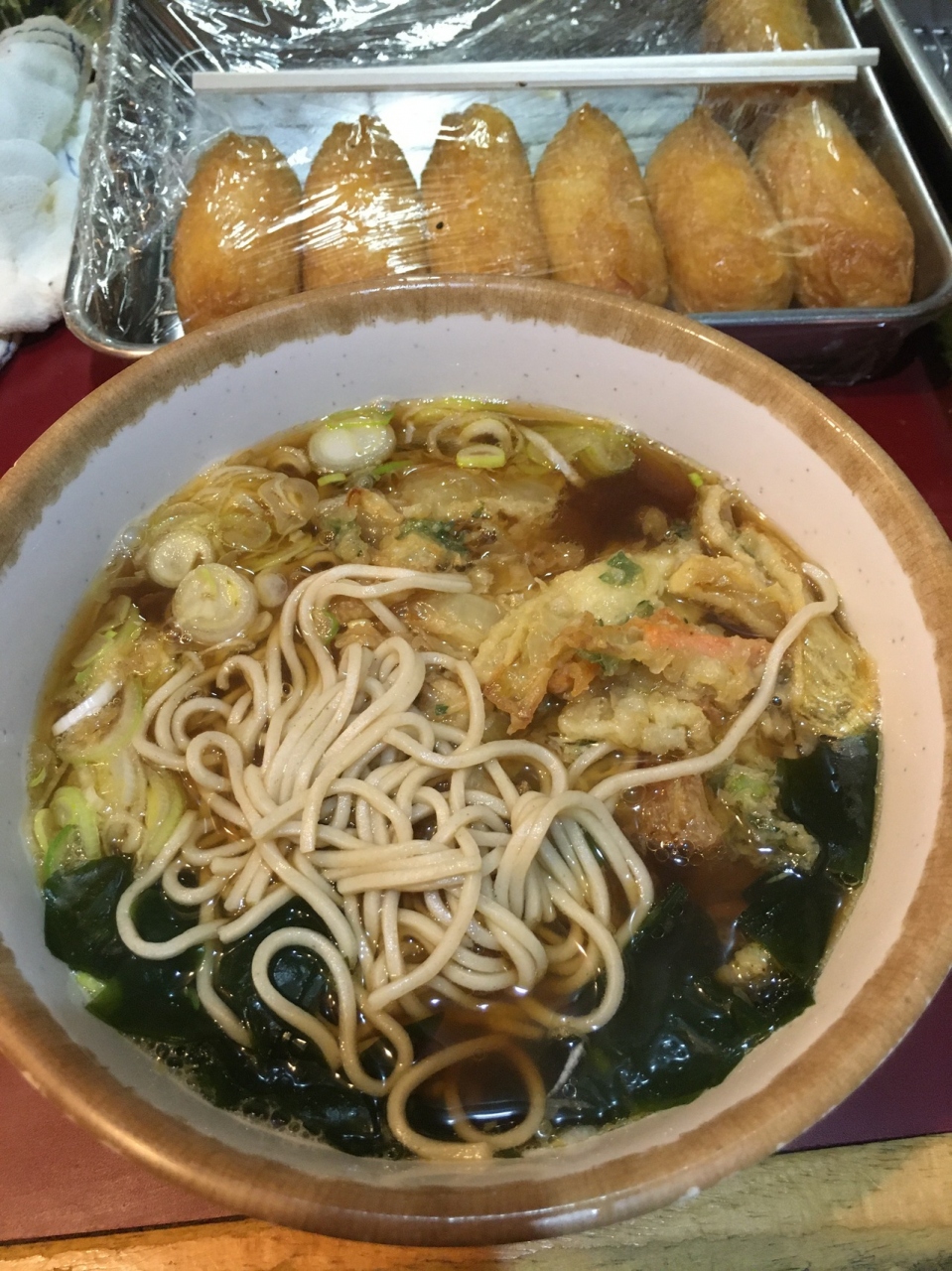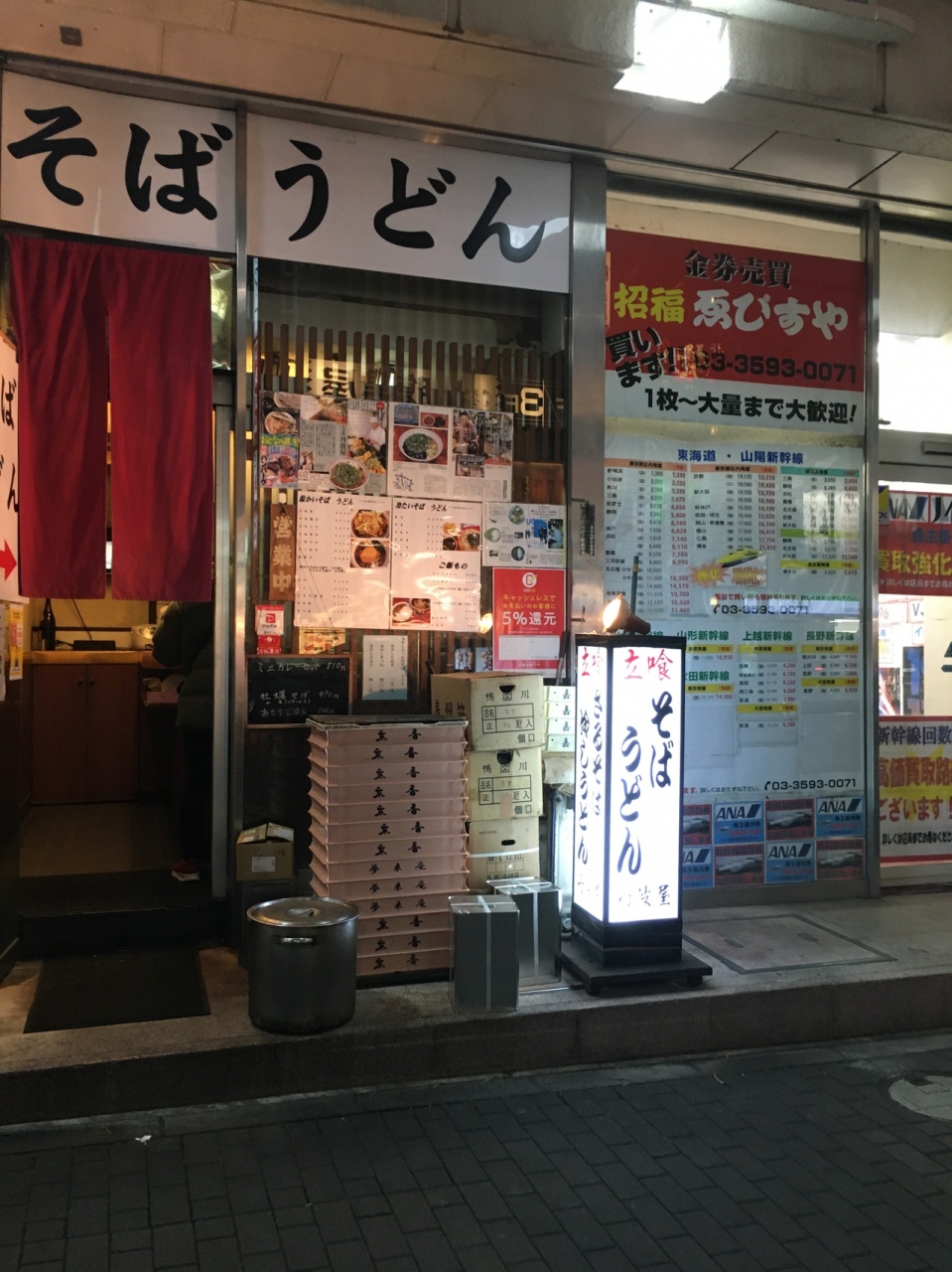 カウンターのみの立ち食いの店で7~8人ぐらいしか入れない狭い店。かき揚げそばを注文。料理と引き換えに現金を支払います。そばは少し伸びたような素麺のようなそばでした。かき揚げは具が結構入っていて、ツユに染み込みました。