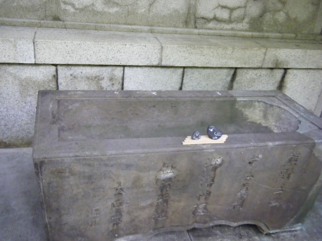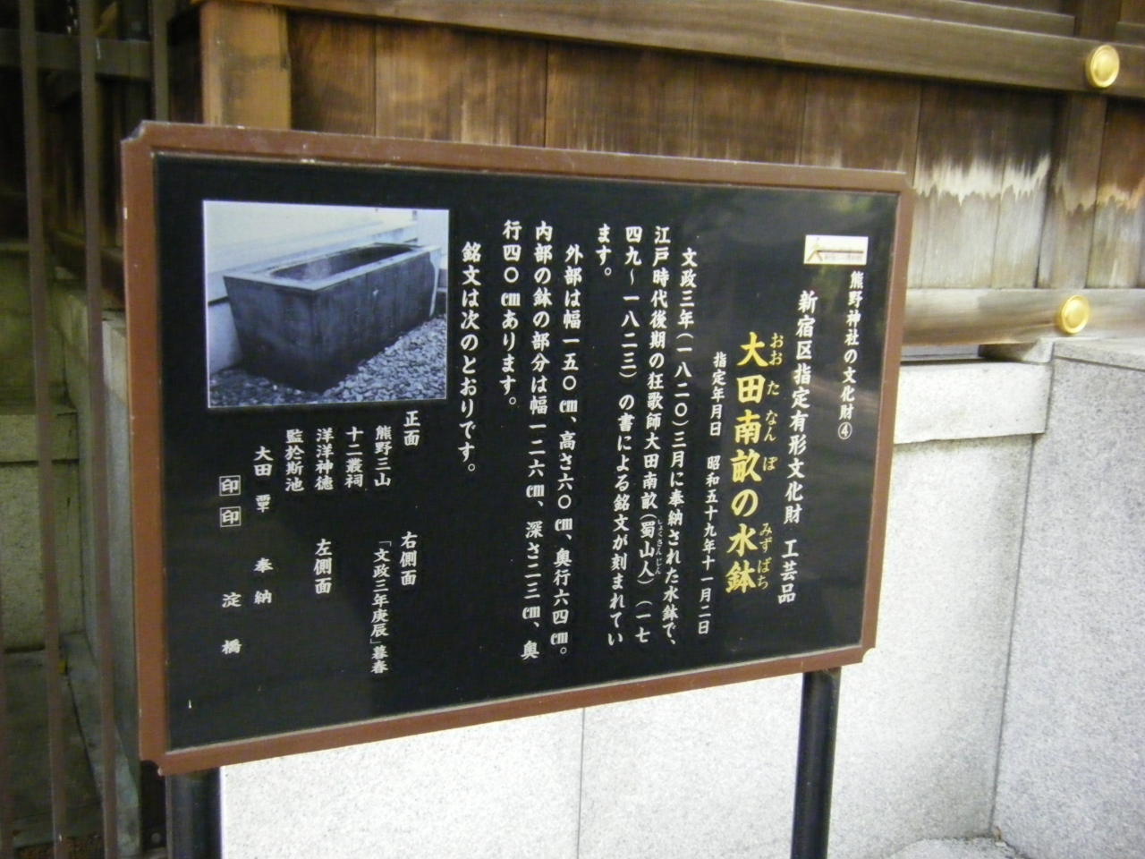 2019年8月に新宿付近を散策した際に立ち寄りました。東京都庁のすぐ西側に広がる新宿中央公園内の一角にある熊野神社の境内にあります。1820年に奉納された水鉢で、江戸時代後期に活躍した狂言師「大田南畝」によって奉納されたものだそうです。大きくて立派な水鉢で、個人でこういったものを奉納していたことに驚きました。フェンスに覆われて実際に触れたりすることはできませんが、彫られている文字などはしっかりと見ることができますし、見ごたえがあって良かったです。