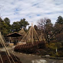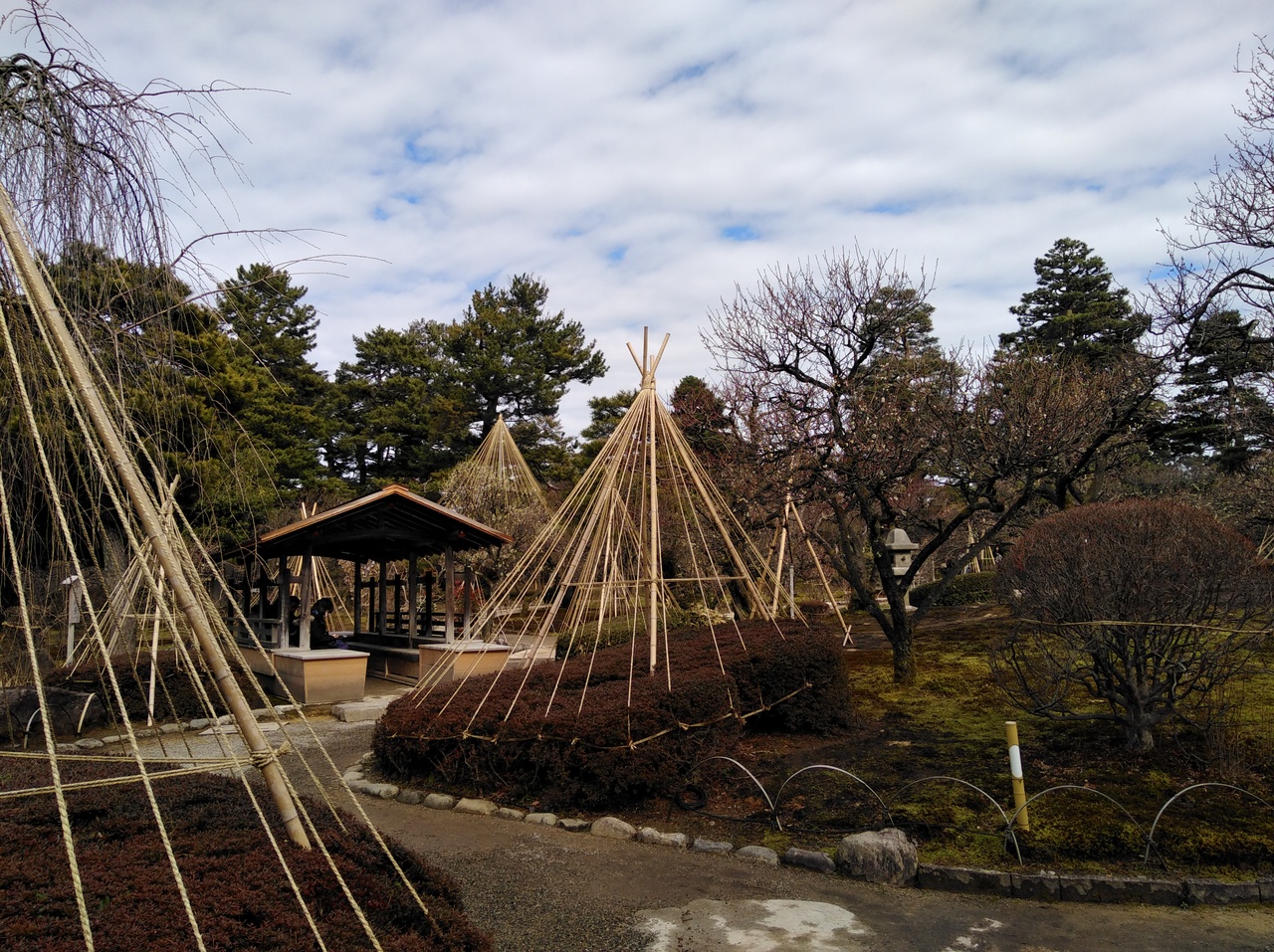 初めての兼六園は雪吊りの美しい景色を見たくて出掛けました。暖冬で2月でも雪がありません。前日に少し降った雪で薄っすら芝生が白くなっている程度でした。