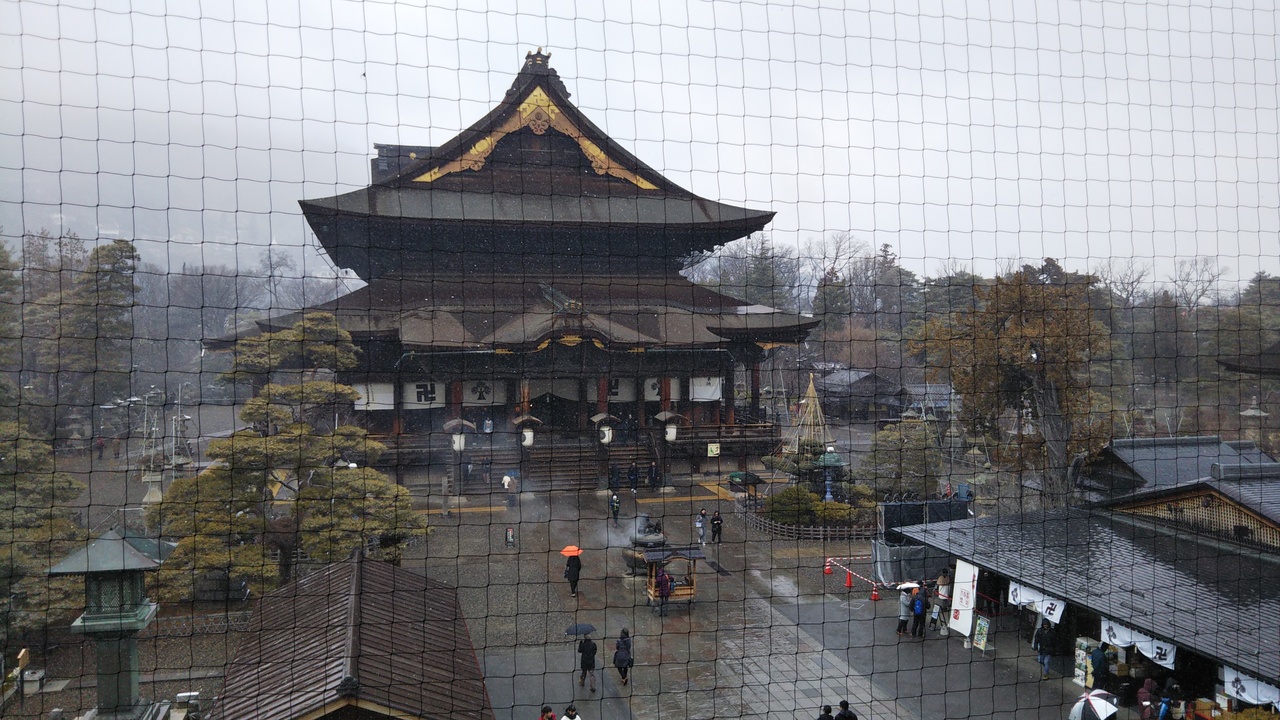 信州善光寺の御朱印巡りで来ました。靴を脱いで階段を上がると入口があり、ここで御朱印がいただけました。ここから三門内部に入りますが、階段が狭くて急でした。三門内部には仏像が安置され、四国八十八ヶ所霊場のお寺もまつられ、一周できるようになっていました。三門には柵があるので眺めは今一つでした。
