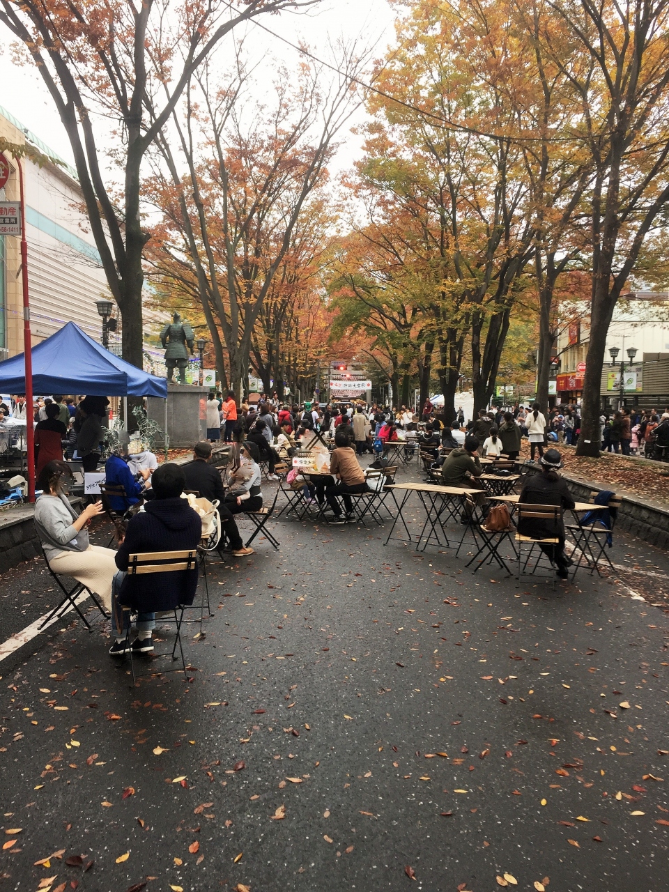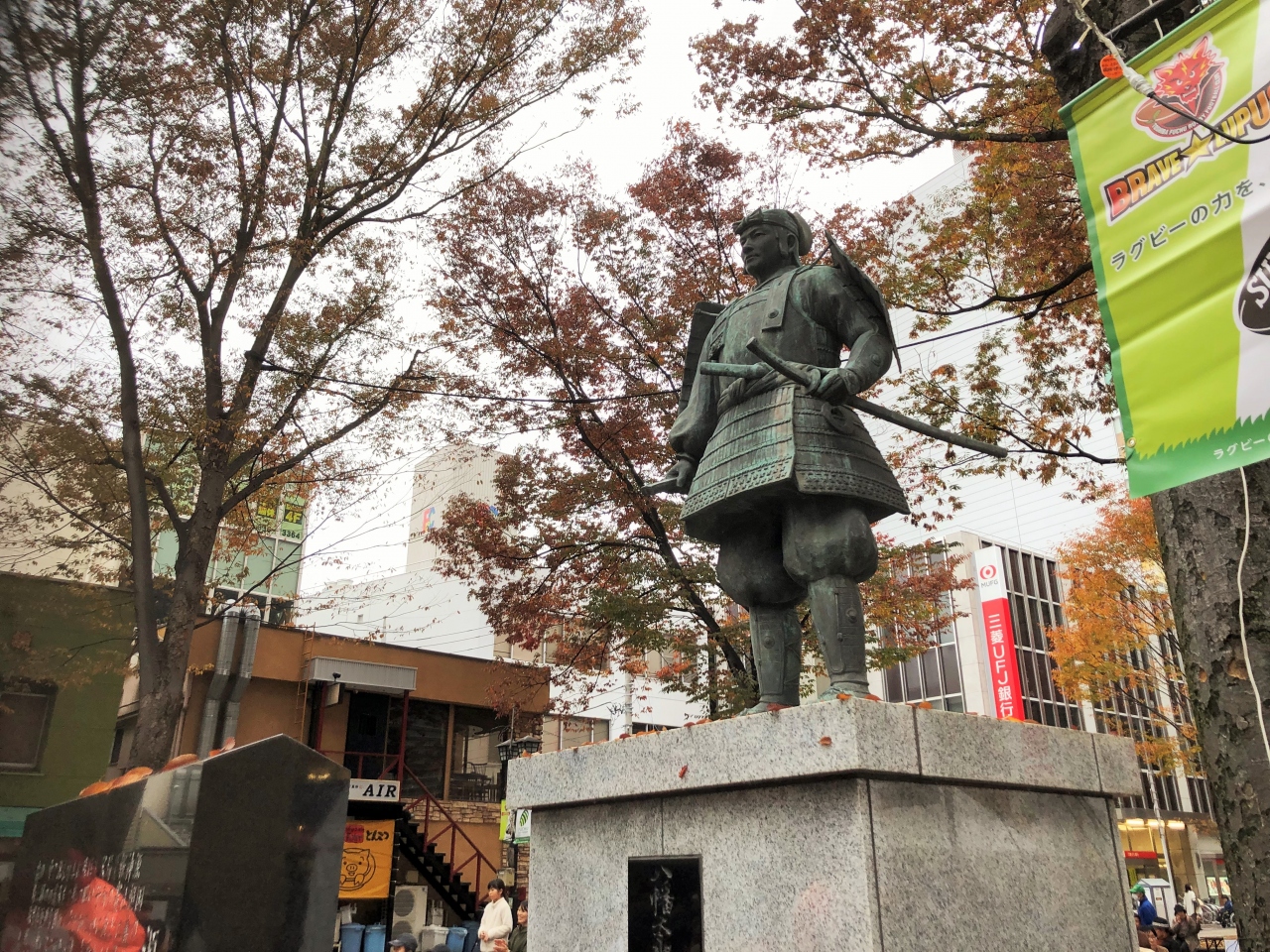 日祝日は歩行者天国になってお近隣には大きなショッピングセンターやオープンカフェ等もあり、にぎやかでおしゃれな空間でした。途中、源頼義の銅像も建っています。