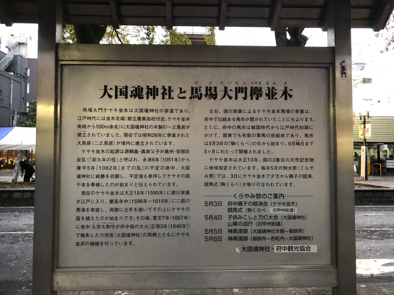 大國魂神社の参道として、約1000年前に源頼義、義家親子が戦勝を祈願しケヤキの苗木千本を奉植したのが始まりだそうで全長が550m程です。江戸時代には家康が馬場を寄進したそうです。故に、馬場大門のケヤキ並木。ケヤキ並木として唯一の国指定天然記念物だそうです。
