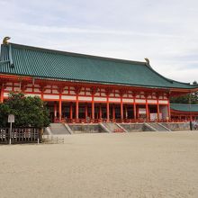 大極殿、東の蒼龍桜、西の白虎桜、壮大な朱の社殿は美しく感動です。