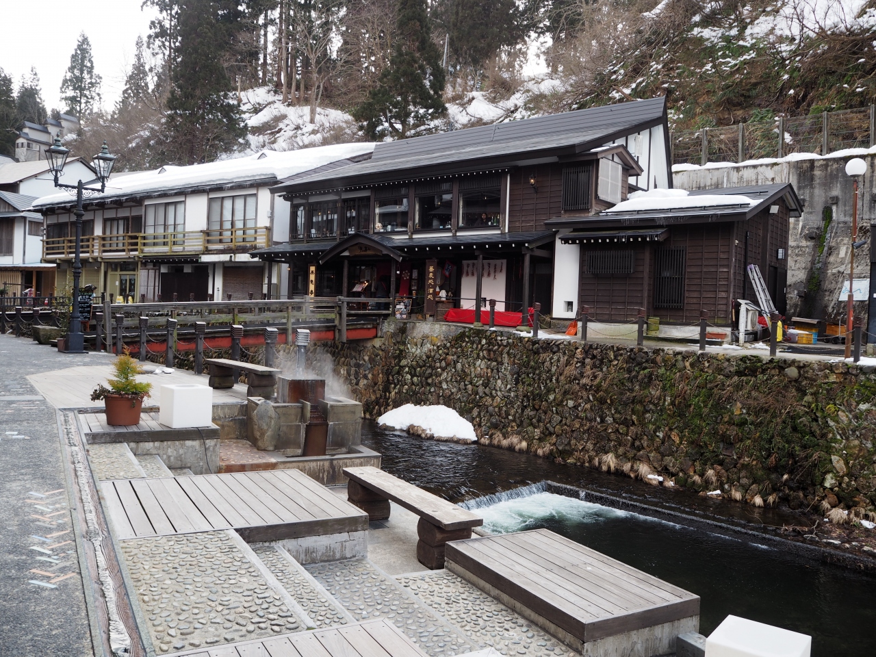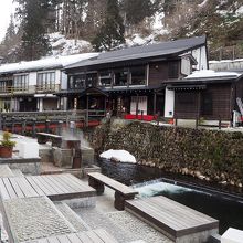 銀山温泉の入り口からほど近い場所にある足湯です。銀山川のそばにあって、川を眺めながら足湯を楽しめるように席が設置されていました。無料で誰でも利用できます。冬でしたが雪不足のためまったく積もっておらず、こちらの足湯も利用可能でした。