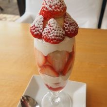 容器に苺ソースを注ぎ、生クリームを絞り、半分にカットしたイチゴを容器の内側に張り付け、生クリームを更に絞り、バニラアイスを盛り、苺をまたトッピング。