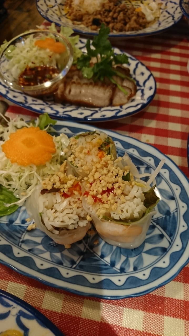 店内はそれほど狭くないのですが、テーブルが少し小さいです。荷物かごはありました。生春巻き、豚トロのグリル、ソムタム、パッタイ等をオーダーしました。