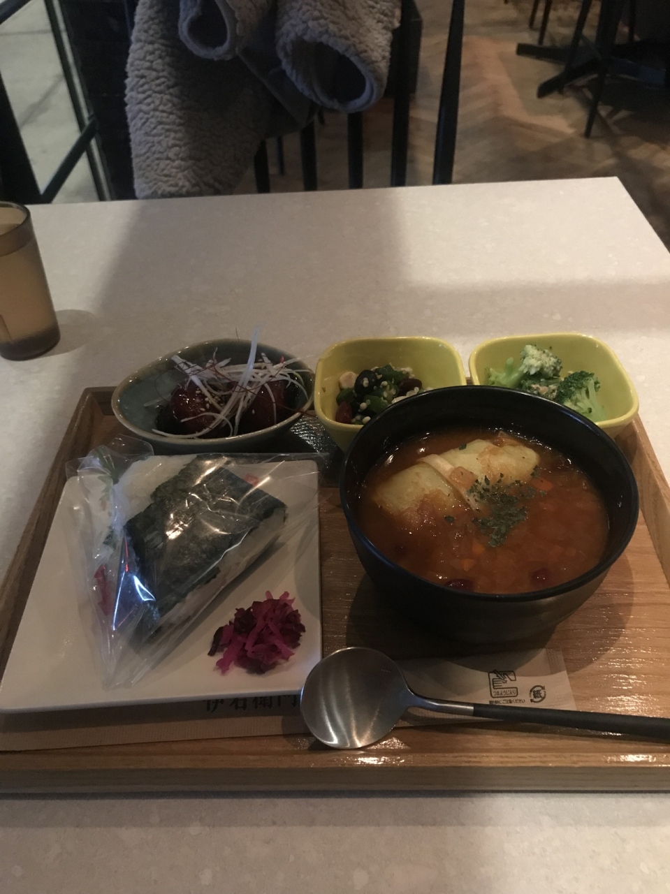 品川フロントの一階にある、伊右衛門カフェになります。スープとお惣菜におにぎりの御膳から自分で好きな組み合わせを選べます。ミネストローネスープにお惣菜を2種類とミートボールに、おにぎりはささみ明太結びです。