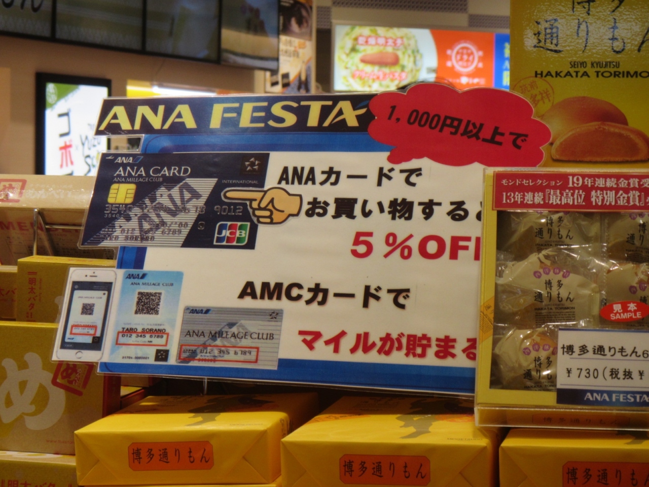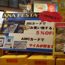 クレジットカードのANAカードでお買い物をすると5%OFF、AMCカードを提示するとANAマイルが貯まるそうです。