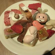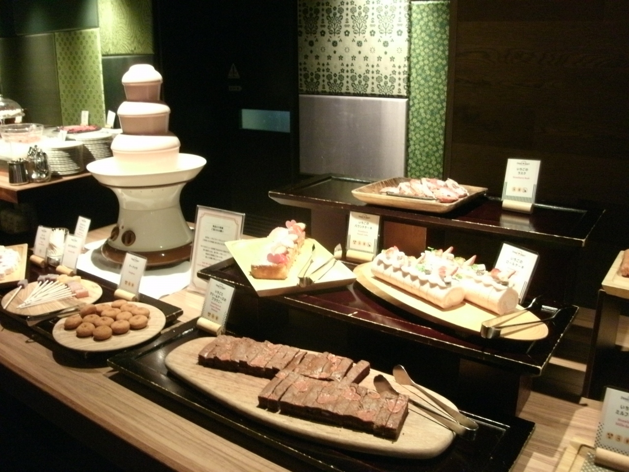 期間限定で開催されている“いちごのスイーツブッフェ(90分制、3500円)”を頂きました。内容は、いちごのスノーボール、パウンドケーキ、マドレーヌ、ヨーグルトのムースなどいちごのケーキ類が21種類とアイスクリーム6種、ソフトクリーム、ストロベリーチョコレートファウンテン。ライトミールとして6種のサンドイッチ、白身魚とエビのボンベイ風、ミートローフ、パスタ、カレーなど。