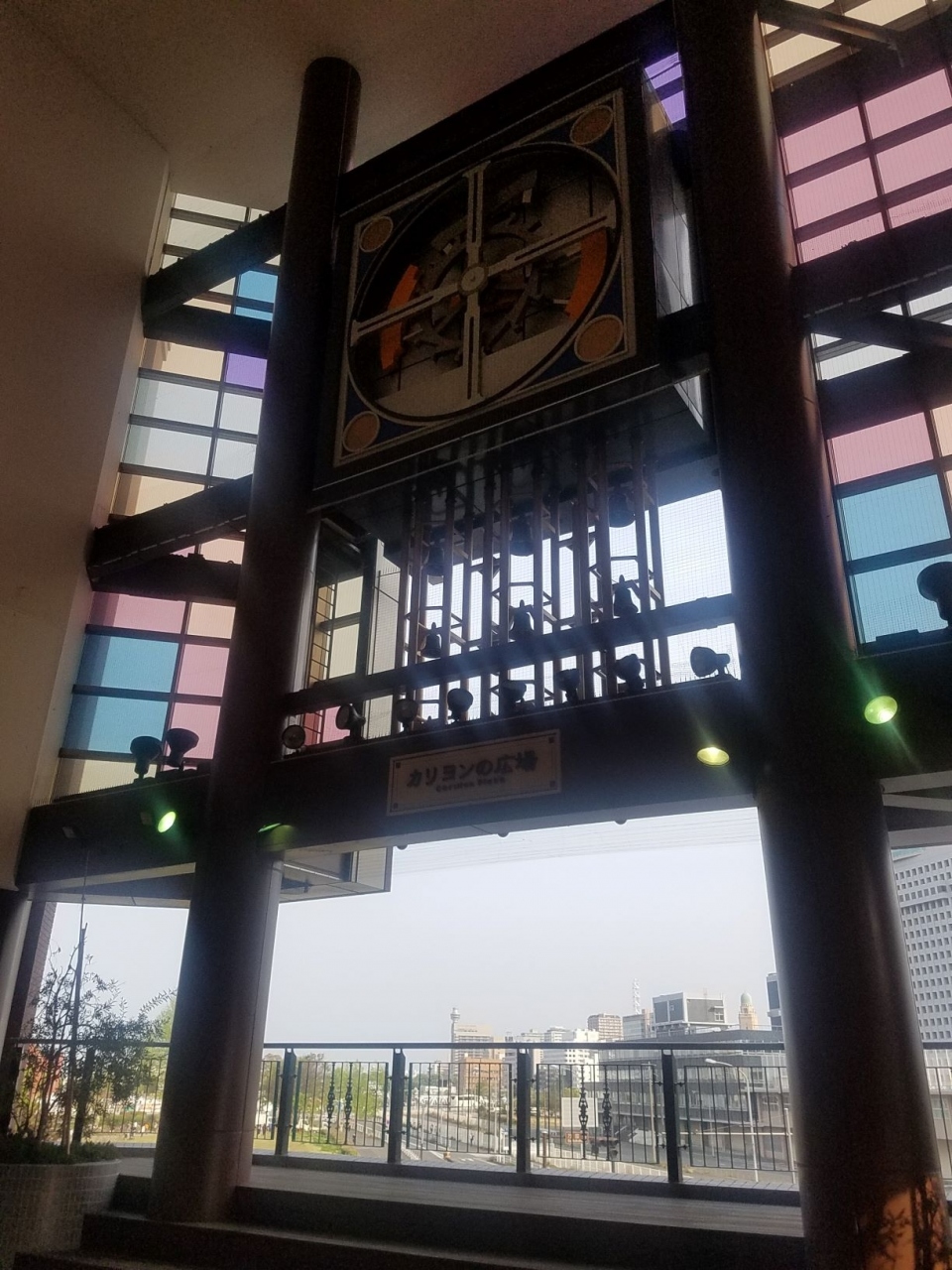 新港サークルウォークから直結している2階に入ると南東の角にカリヨンの広場がありました。大きな時計があって毎正時に鐘が鳴り響きます。周囲にはベンチもあるので買い物で疲れたらここに来て休むとお得なかんじです。
