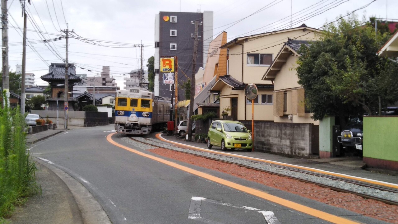 藤崎宮の近くに、熊本電鉄の線路が一般道に出るところがあります。一般道と商店や民家の間を通ります。路面電車ではなく、大きい郊外電車がクルマと並走し、電車のすぐわきにはお店の軒先や民家の玄関、駐車場があり、とても不思議な風景です。