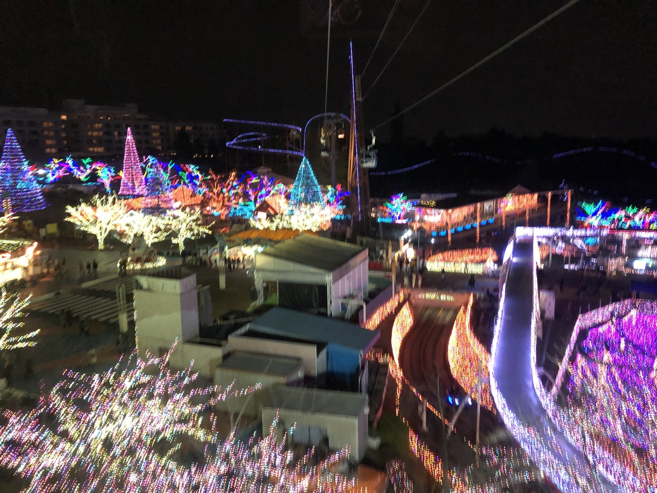 毎週土曜の夜だけに行われる花火と噴水のショーをタイミングよく見られました。なかなか良かったです。やはり土曜の夜だからなのか寒い時期にもかかわらずかなりの人出で混んでいました。このショーが終わると帰る人が多いみたいで出口に人が流れます。パークと駅までを結んでいるゴンドラに乗るのにかなり列が出来ていました。
