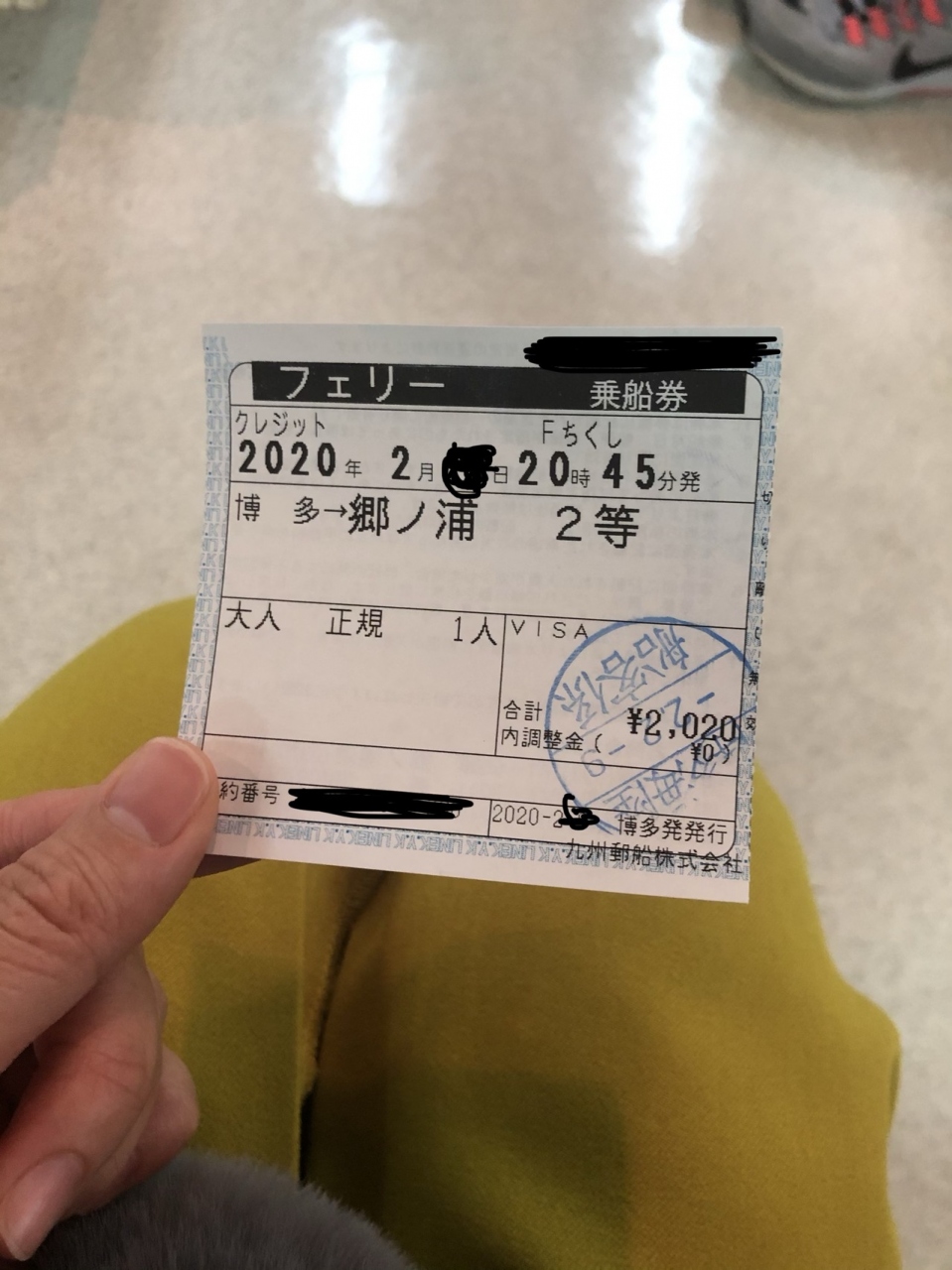 当日博多港でチケットを買おうとすると、長蛇の列…無事チケットを買えても、乗船のためにまた長蛇の列…この日は日曜夜便だったため、土日を本土で過ごす島民の集団が多く、見事な混雑ぶりでした。
