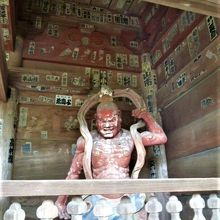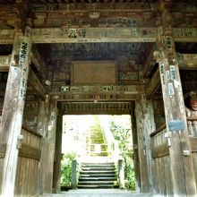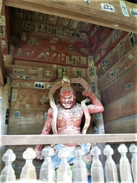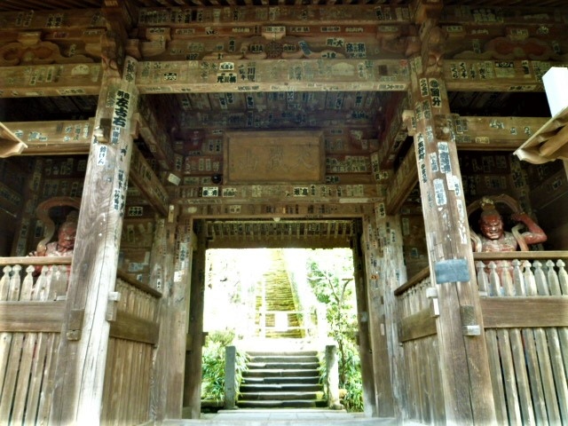 多数の`十一面杉本観音`奉納旗を両側に配し石段を上ると、風格のある`茅葺の八脚門`の山門;[杉本寺 仁王門]が…境内の案内図には`鎌倉のお寺では茅葺は珍しい`と。 向かって右側の金剛力士像が阿形像、左側は吽形像が立って(左右どちらでも;奈良の一部のお寺では違いましたので,,)、`御本尊を守っています`…薄い彩色が残っていましたので歴史を感じました。あと、山門には千社札が沢山ですね♪