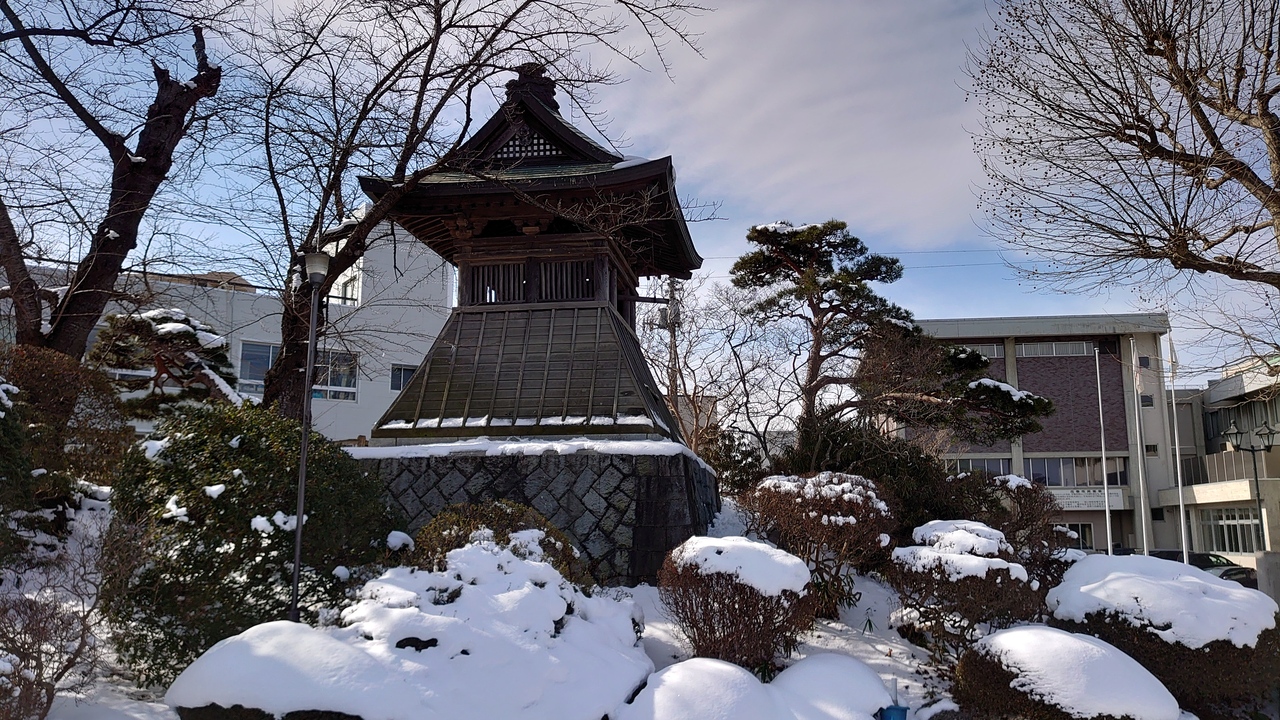 花巻の市役所や体育館が集まっているエリアに、かつて花巻城にあった鐘が設置されていました。変則的な交差点で人や車の往来が気になり落ち着かない場所であることと雪が積もって近づきにくいことで遠くから眺めるだけになりました。中は暗くて見えませんでした。