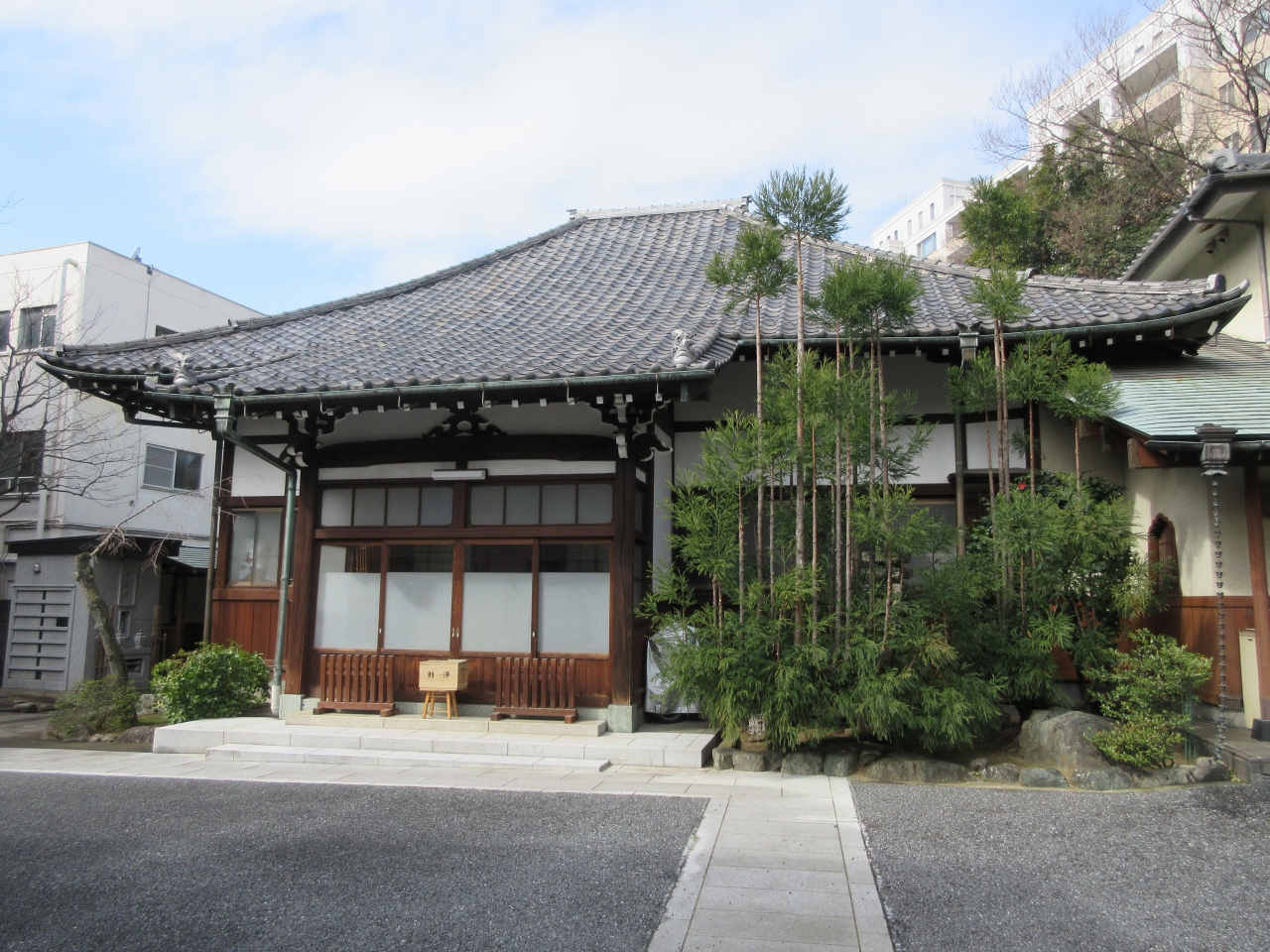 泉岳寺駅から6分ほど歩いたところにある曹洞宗寺院です。泉岳寺の塔頭寺院として1654年に創建されました。木造山門の先に木造本堂前に珍しい枝ぶりの木がありました。本堂横に休憩所と墓参用の井戸がありました。本堂裏の斜面に墓地が広がっていました。説明板がないので詳細は分かりませんでした。珍しい植木を見に寄るくらいでいいと思います。