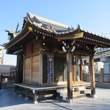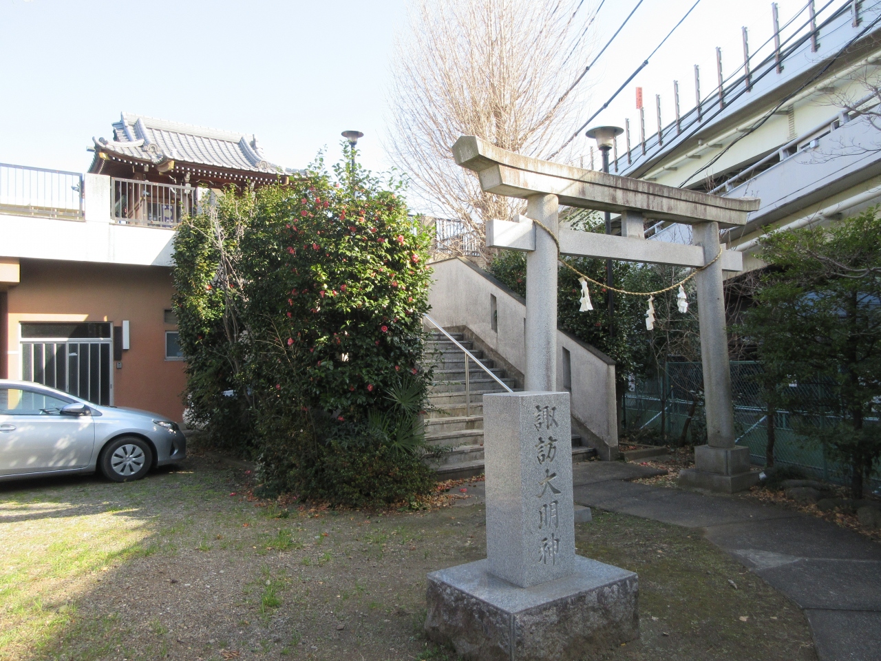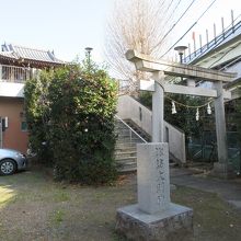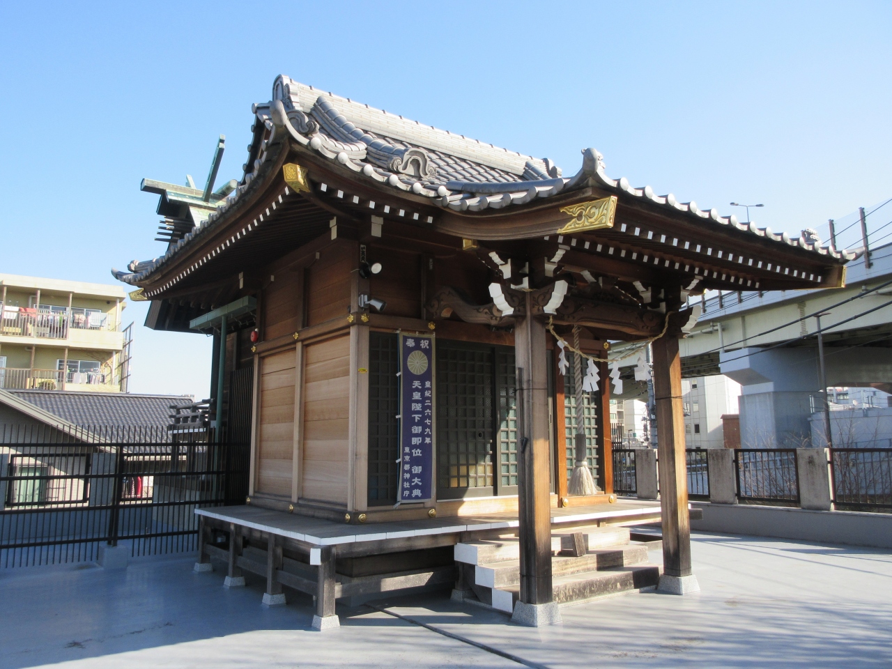多摩堤通りに面していて、二子玉川駅から7分ほど歩いたところにあります。石造り鳥居が2基あり、鉄筋コンクリートの建物の屋上に木造社殿があります。屋根の鬼瓦は波のようでした。境内に車があり、個人的な駐車場のようにみえました。神殿への入口は柵が閉まっていて見ることはできませんでした。境内の雑草取りをしている人がいて、大切にされている神社であることが分かりました。多摩川を渡る246号線の高架が横にあり車の音が気になりました。
