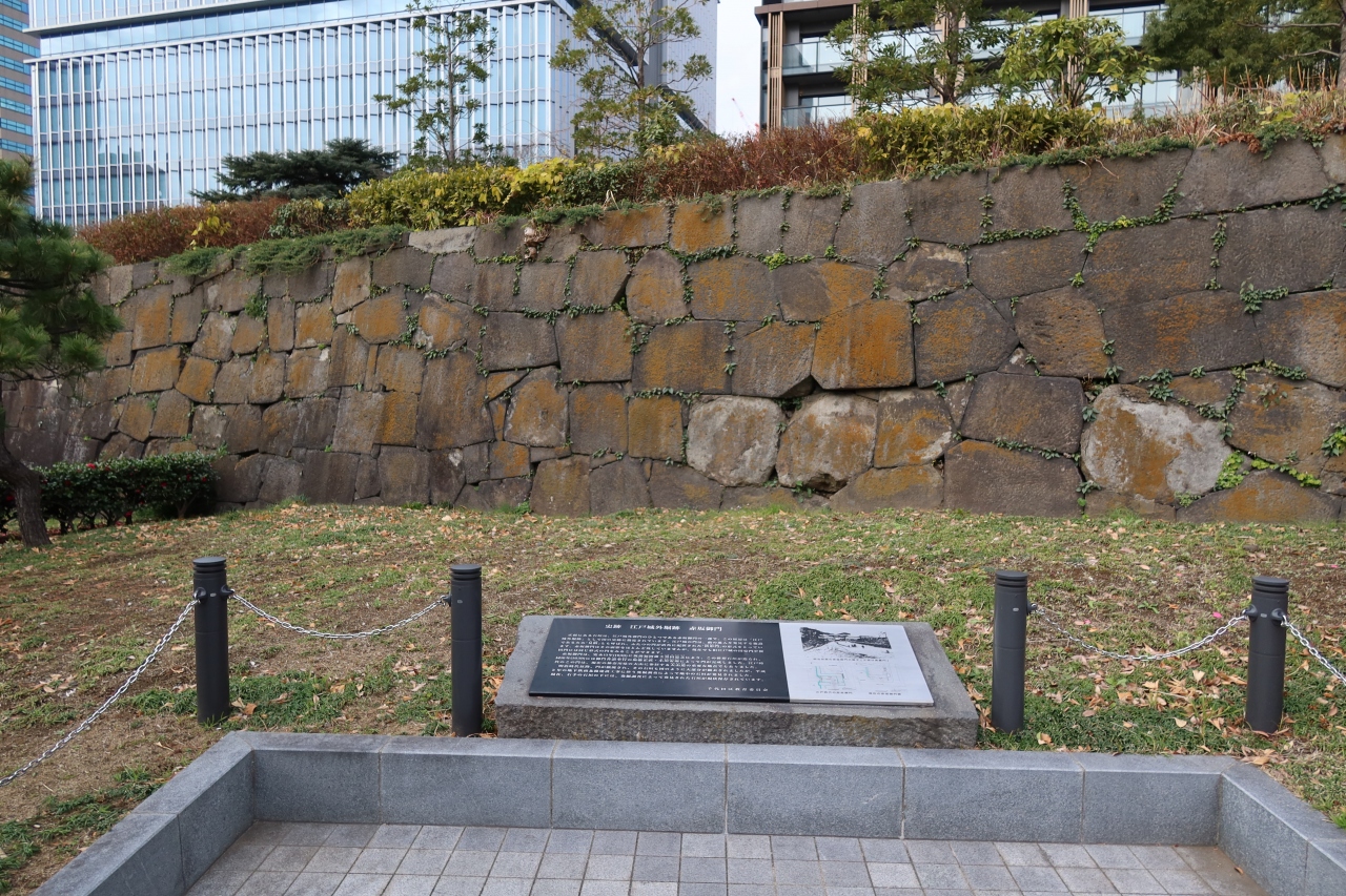青山通りを赤坂見附跡から少し上った先が小さな公園の様になっており、そこに江戸城外堀跡の石垣が残っています。かつてこの地にあった江戸城の外堀に作られた赤坂御門の石垣で、案内盤にある古写真とは大分姿が変わってしまっていますが、地中にも石垣の遺構が残っているそうです。お城の石垣は時代や場所によって、その造りが異なり面白く感じます。