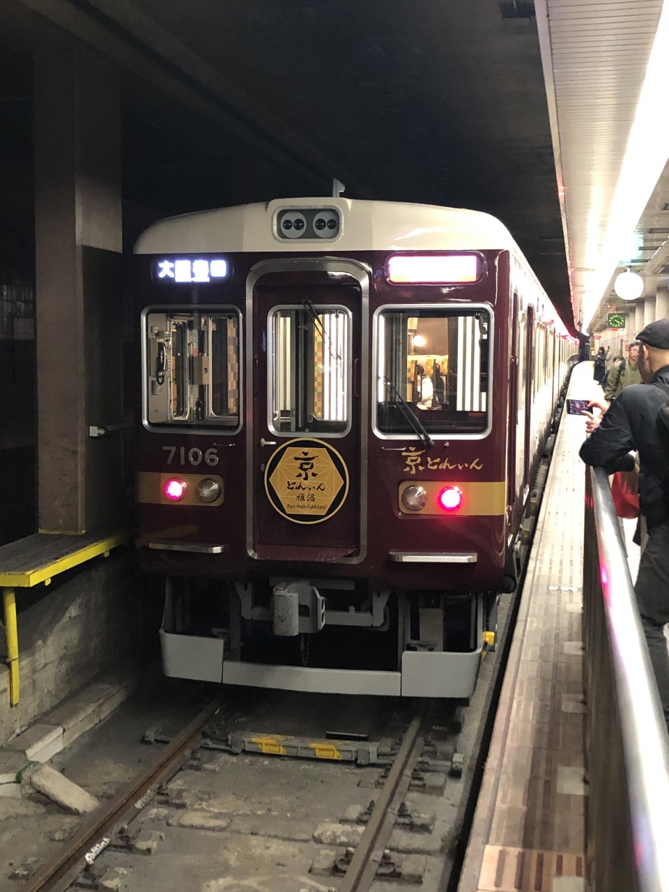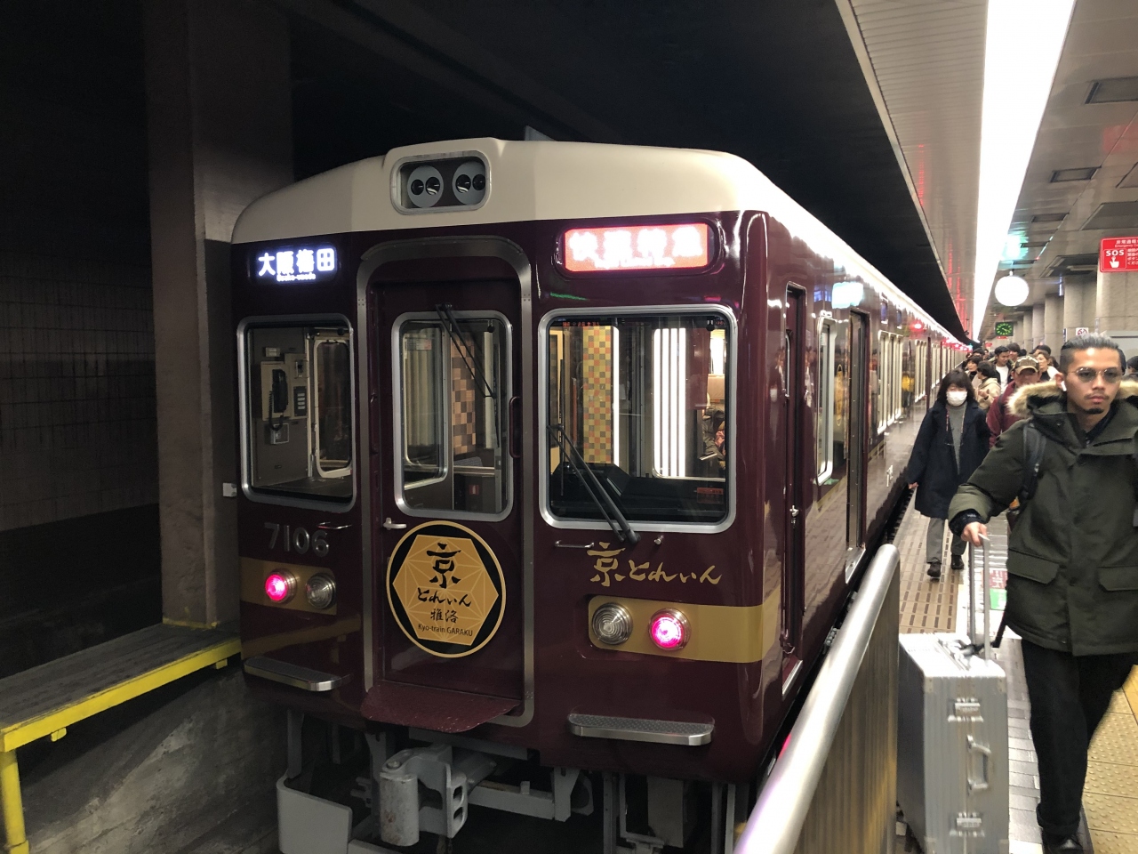 「京トレイン雅洛」は土日祝のみ、1日4本(往復で8本)だけ快速特急として運行される。平日に走らせないのは勿体ないが、その分列車の希少性は高い。座席は指定ではなく特急料金は不要、普通料金の大阪梅田-京都河原町で片道400円。停車駅は他の特急と同じく大阪梅田から順に十三、淡路、桂、烏丸、京都河原町の6駅だ。