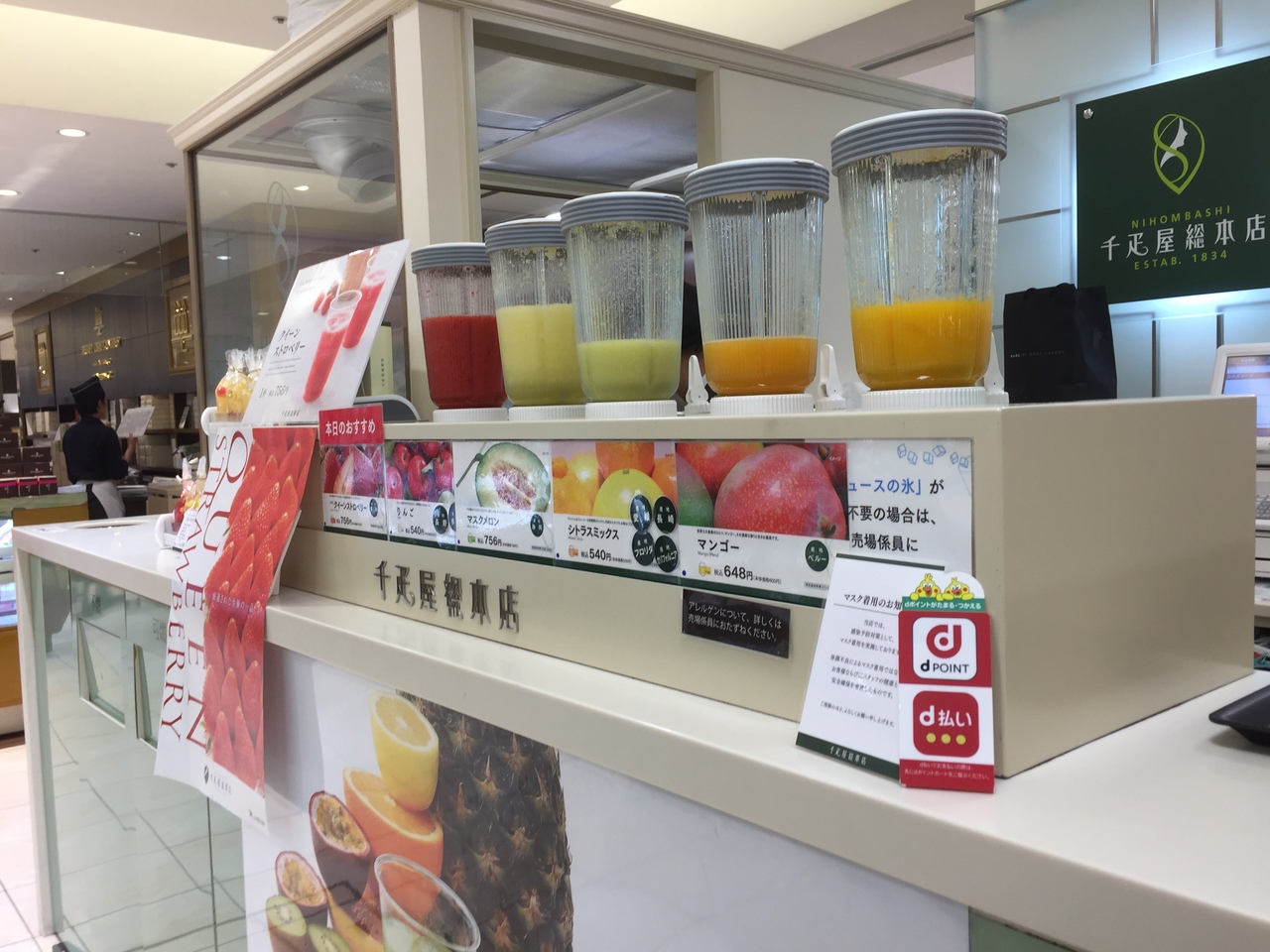 説明するまでもない高級フルーツのお店 千疋屋さんです。こちらの店舗にはジューススタンドがあります。千疋屋さんはふつうでもフルーツがお高いですから、そのフルーツを使ったジュースと考えたら 割安なような気がします。