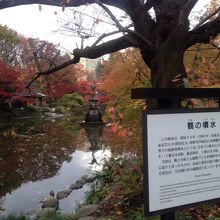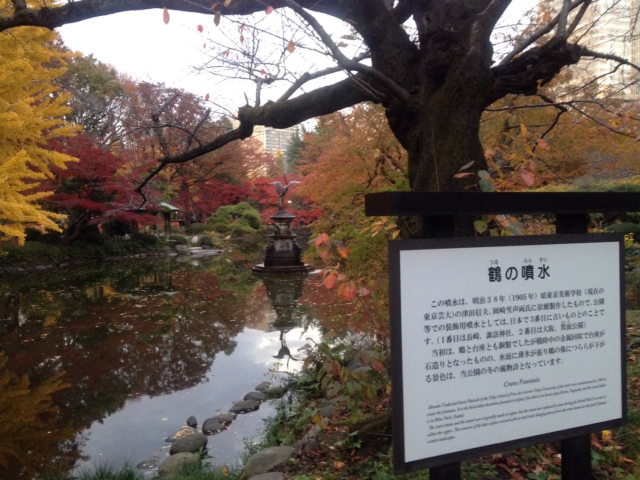 雲形池の中程にあります。色が暗いのとあまり大きくないのとで初めは見つけ辛かったですが一度見つければ紅葉を辿りながら池の周囲を回りながら鶴の姿も確認して写真を撮りまくっていました。でもよく考えたら口から水を噴き上げているの図はシュールでもありますね。