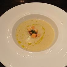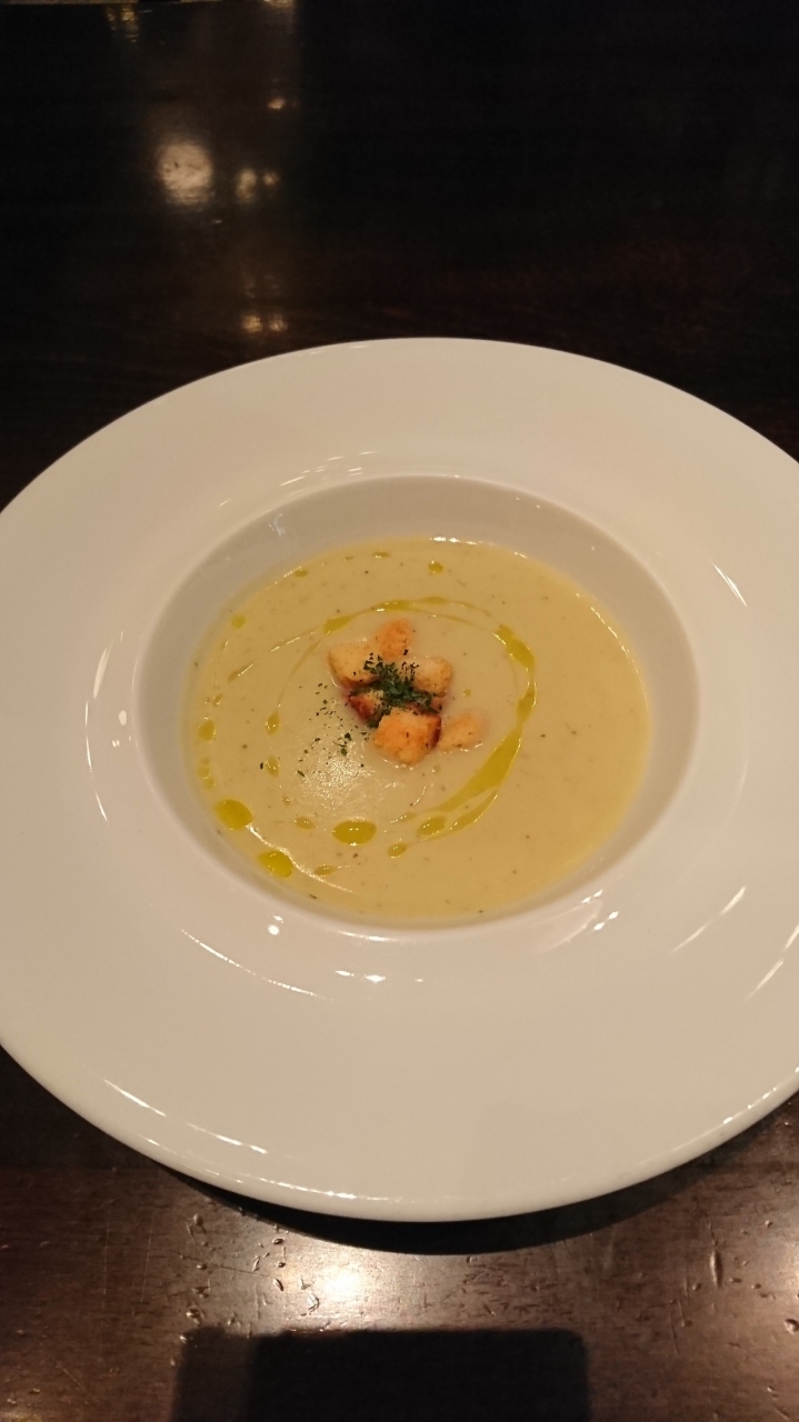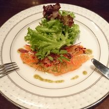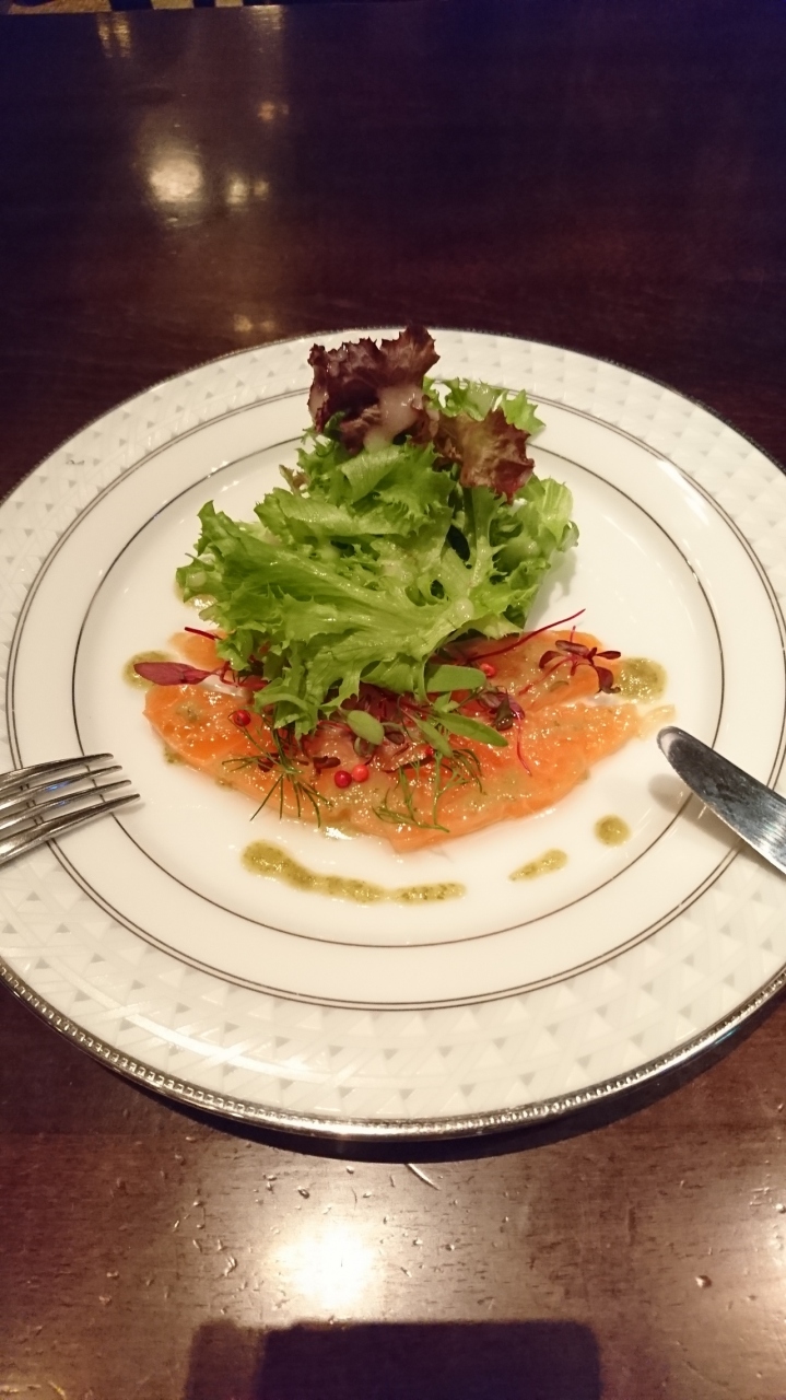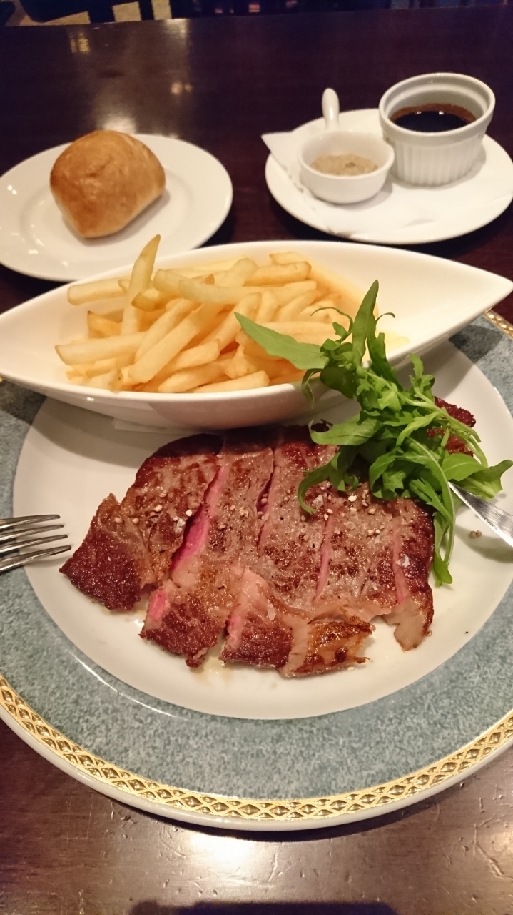 サーモンのカルパッチョ、本日のスープ(じゃがいものポタージュだったかな?)と、ステーキとフレンチフライ。