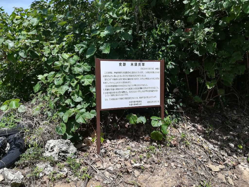 途中で案内表示が途切れるので若干迷いましたが、海岸のすぐ手前に説明書きの書かれた看板が立当てられていました。遺跡そのものは埋め戻されているようで、貝殻が露出しているようなこともなく、すぐ側には古タイヤが捨てられている状況でした。