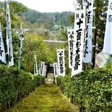 参道は十一面杉本観音奉納旗と苔の石段