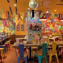 店内に入ると天井にミラーボールがあって、壁にカラフルな絵が描かれています。