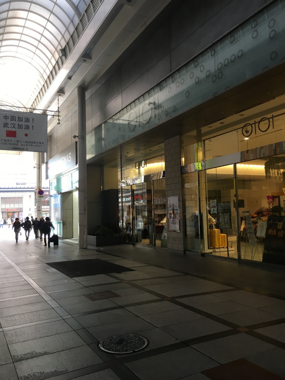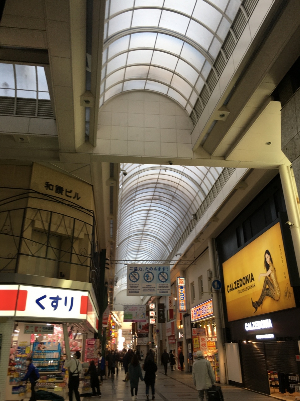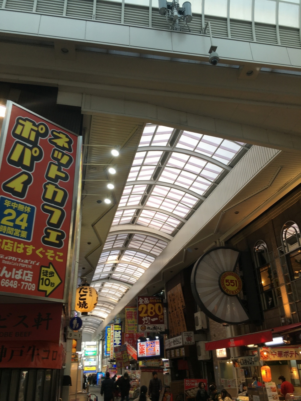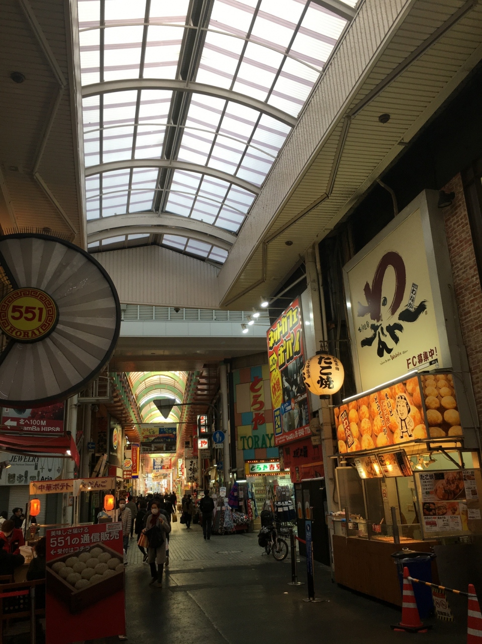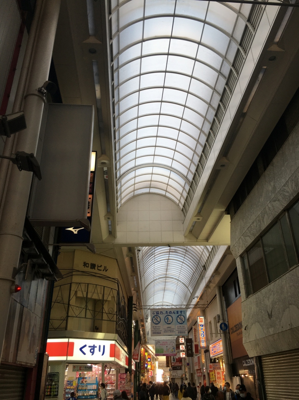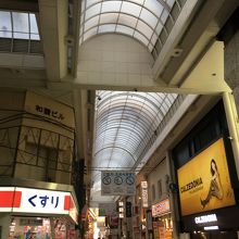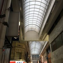 高い天井で雨が降っても濡れなくて便利でした。ドラックストアーがたくさんあり、固まっていて5店舗ほどありマスクを探す人で賑わっていました。たこ焼き屋等もあるので食べ歩きしている人も多かったです。幅は広くない商店街でした。