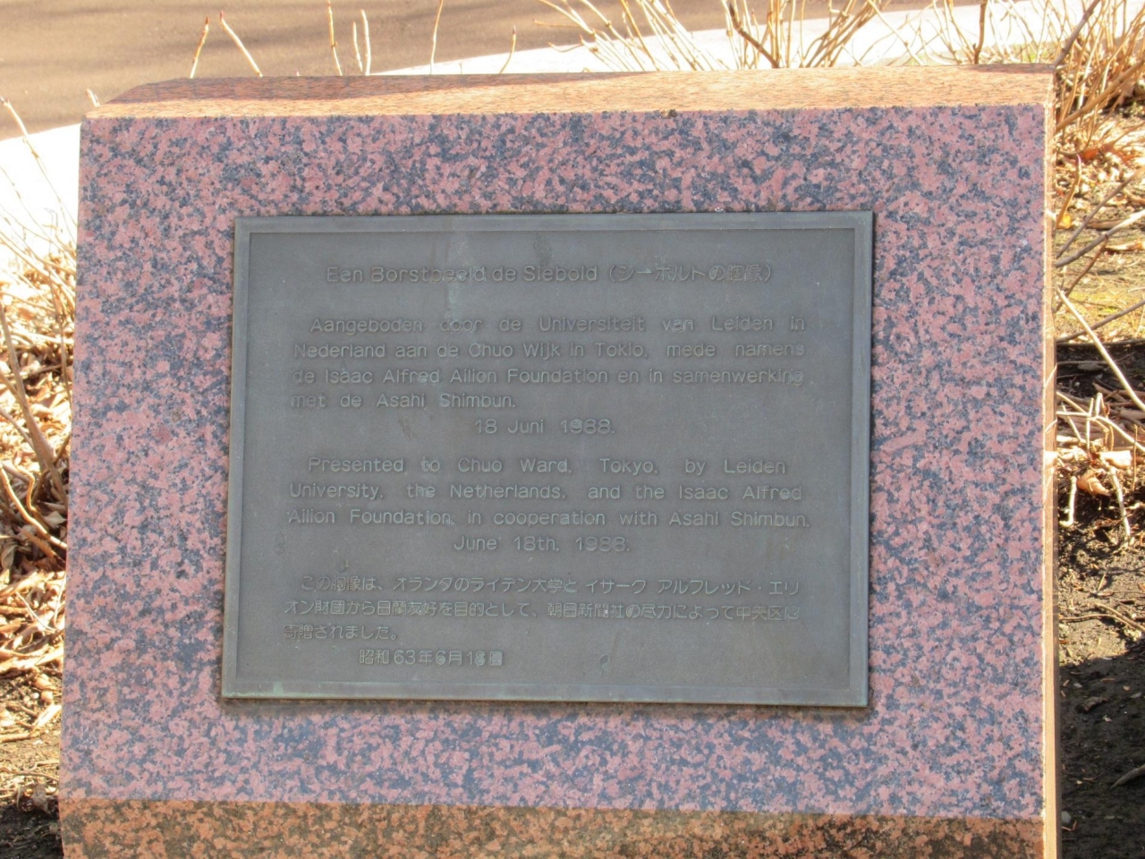 中央区築地7丁目の明石町との境界沿いにあるあかつき公園を訪ねた折、園内で見たものの一つがこの シーボルト像 で、ほぼ東西に長い公園の東側出入口の近くに胸像と説明板などがあります。