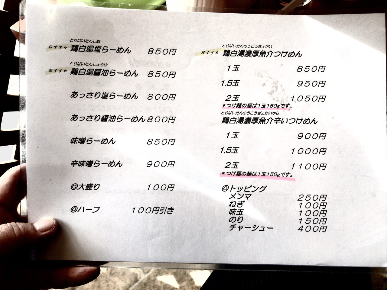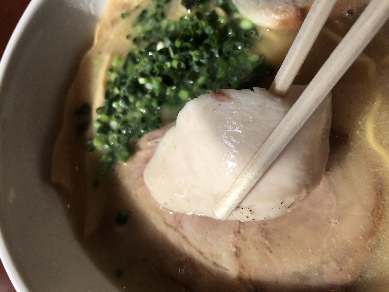 スープはコラーゲンたっぷりの鶏白湯。チャーシューも鶏と豚のチャーシューが一枚づつ。穂先の支那竹は20cmもあって柔らかくて旨い。
