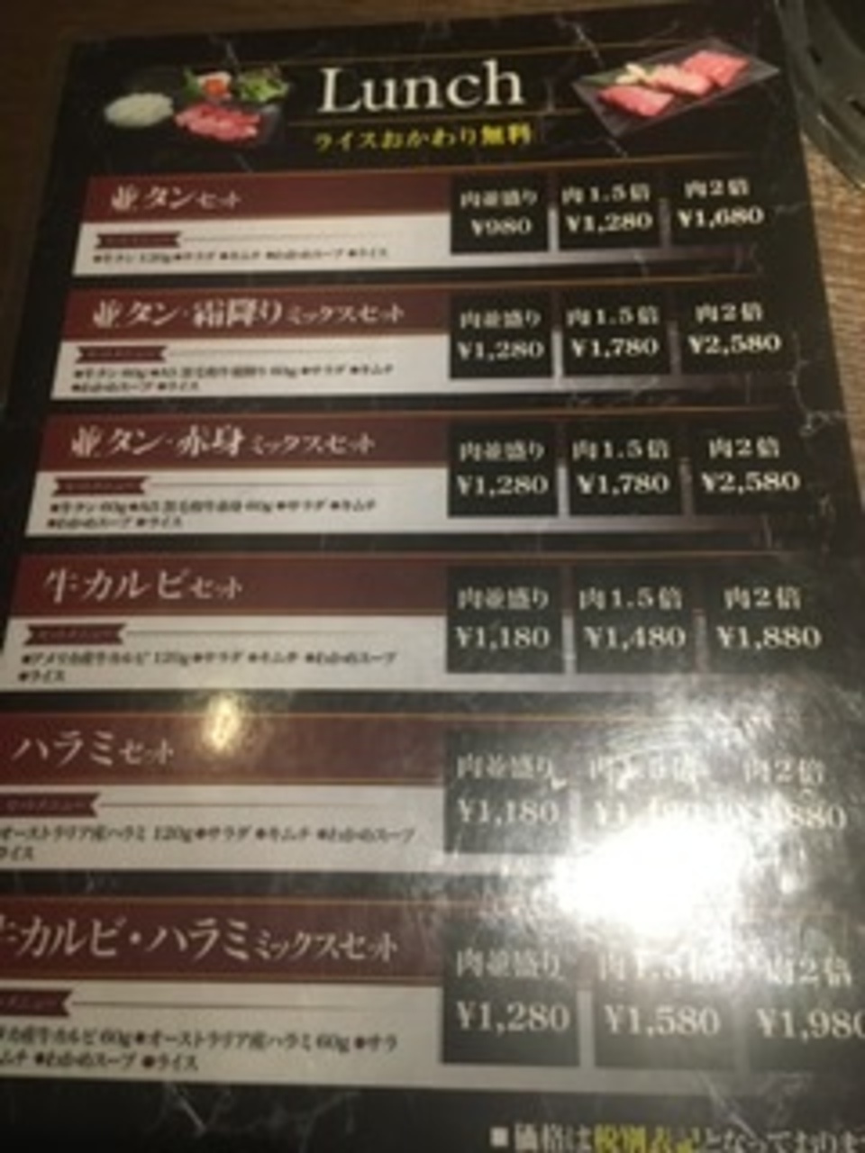 ランチで訪問しました。ランチは980~1280円(税抜)でお肉はいろんな組合せかあります。私はタンの定食にしました。タレが選べてご飯はおかわりできます。スープ、ミニサラダ、キムチがついて980円。美味しかったので今度は夜に行きたいなぁと思います。