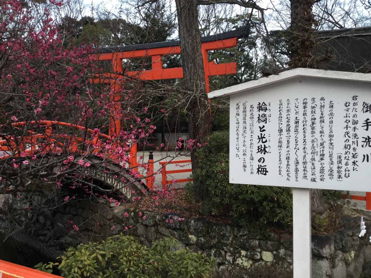 京都の下鴨神社の鳥居をくぐり、右手に小さな川があって御手洗川と言います。行った時は紅梅が鮮やかに咲いていて、朱い橋とその後ろに有る小さな鳥居との景色が春を呼ぶ美しさに溢れていました。尾形光琳ゆかりの梅なので、光琳の梅と言われているそうで、本当に絵に描きたくなる景色です。下鴨神社に手を合わせてお参りして、光琳の梅も見れて、春を感じながら心温まる時間でした。