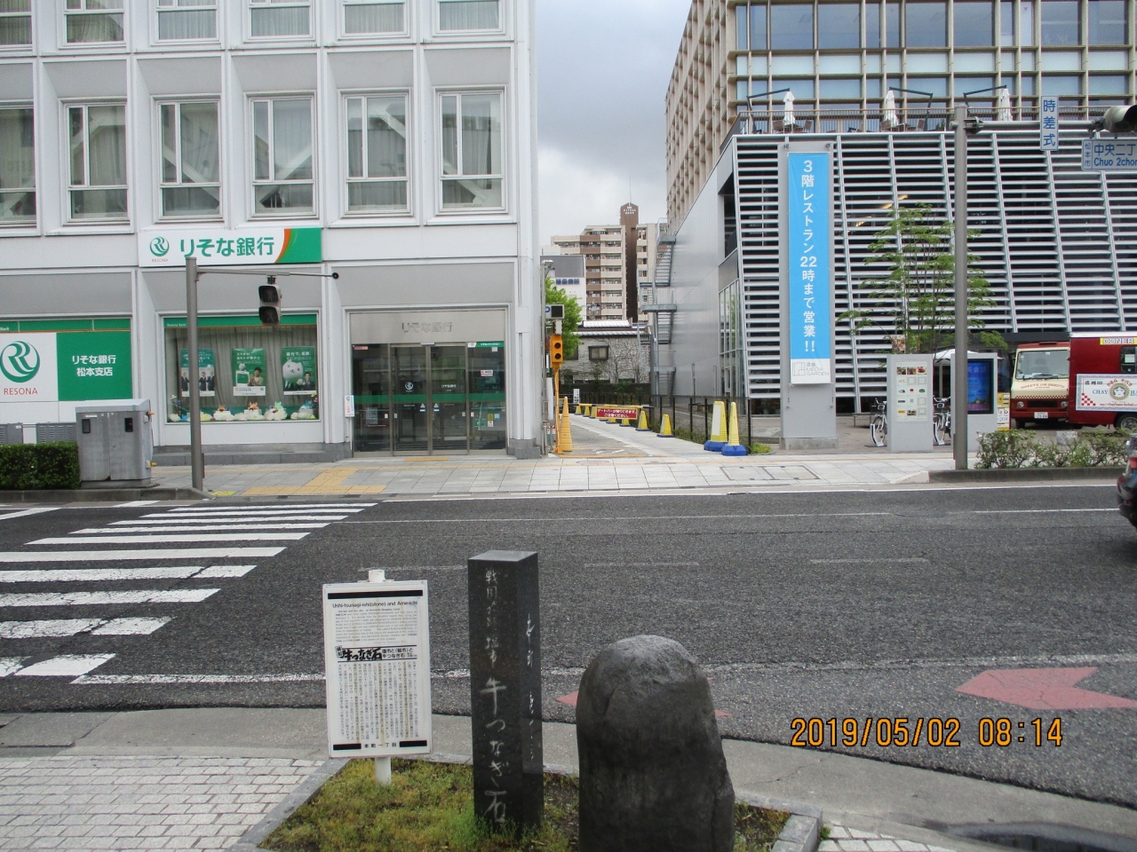 松本城へ通じる本町通りを北上し、老舗和菓子店の「開運堂」近くの交差点にある小さな石です。越後の上杉謙信が敵対していた甲斐の武田信玄に糸魚川から塩を送ったという話からそのとき、塩を運んできた牛をつないだ石という伝説が生まれたそうです。とても目立たない石で何気なく歩いていたら見過ごしてしまいそうです。