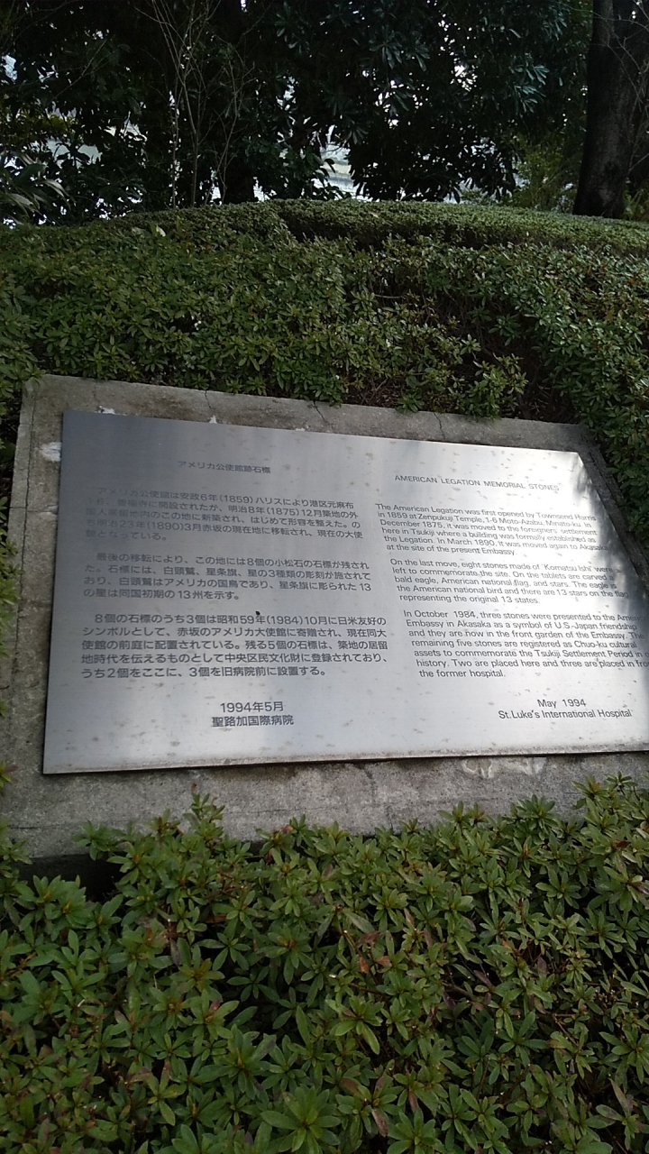 築地の聖路加タワーにある昔のアメリカ公使邸の跡です 現在はアメリカの大使館は麻布の方にありますがそちらの庭にもこちらのモニュメントがあるとのことですがこちらは聖路加タワーの川沿いのエリアに記念碑があります。元々は品川の方のお寺でハリスの時代からこちらの築地に移り現在の麻布にあるという歴史の書かれたプレートがありました