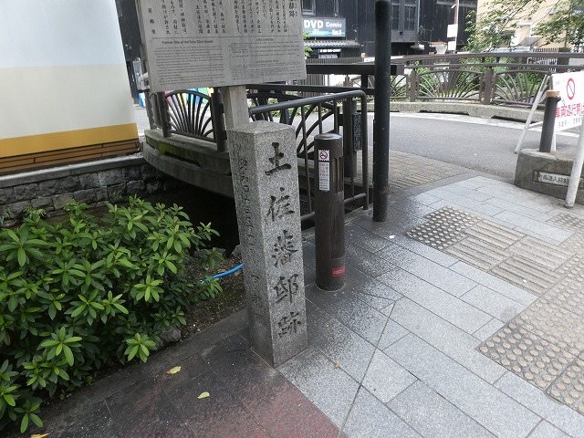 真夏の京都の木屋町周辺をそぞろ歩き中、高瀬川そばに土佐藩邸跡の石碑を見つけました。今では京都の中心と言うべき町中ですが、坂本龍馬や中岡慎太郎たちはここで走り回っていたんですねえ。近くには長州藩邸跡も見かけました。飲み屋が建ち並ぶ現在と当時とではまるで違った町並みなんでしょうけど、大小2本を指した侍達が闊歩したのをイメージするのは面白いです.