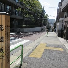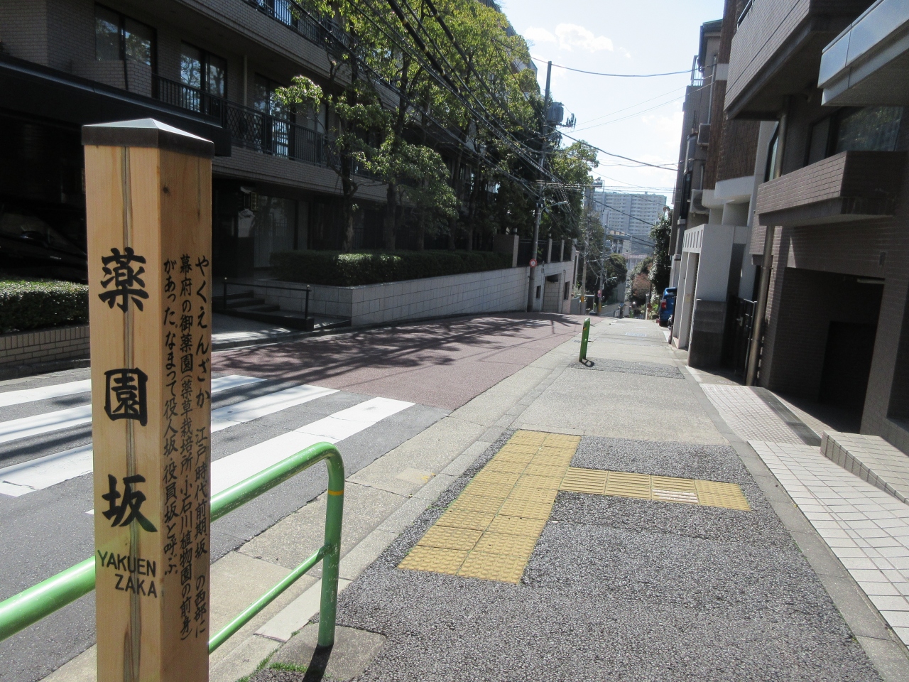 南麻布の高台から古川に架かる四之橋に下る、交通量が多い坂道です。日当たりが良かったことから、江戸時代前期に幕府の薬草栽培所が置かれていたことから名付けられました。現在、坂道の両側にはマンションや一般住宅、イラン大使館、ビルなどが並ぶエリアになっていて、当時の面影は全く見られません。坂の周辺には大使館や寺も点在しているので、散策するのに面白い所だと思います。