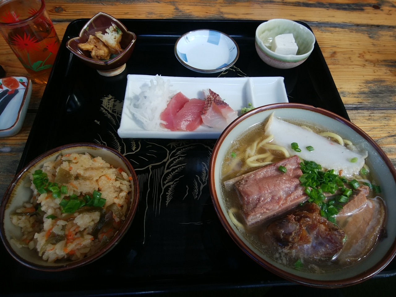 沖縄では、一度は沖縄そばが食べたく思い、沖縄をよく知る友人の紹介で教えてもらったてつこのそばに行ってきました。沖縄の民家の印象の雰囲気のあるお店です。私は、1000円のそば定食を注文しました。沖縄そばに、ソーキ、軟骨、三枚肉が入っており、刺身に小鉢が付いていてとてもお得感があります。肉がとても柔らかく、出汁も食べやすい美味しくてとても満足できたそばでした。
