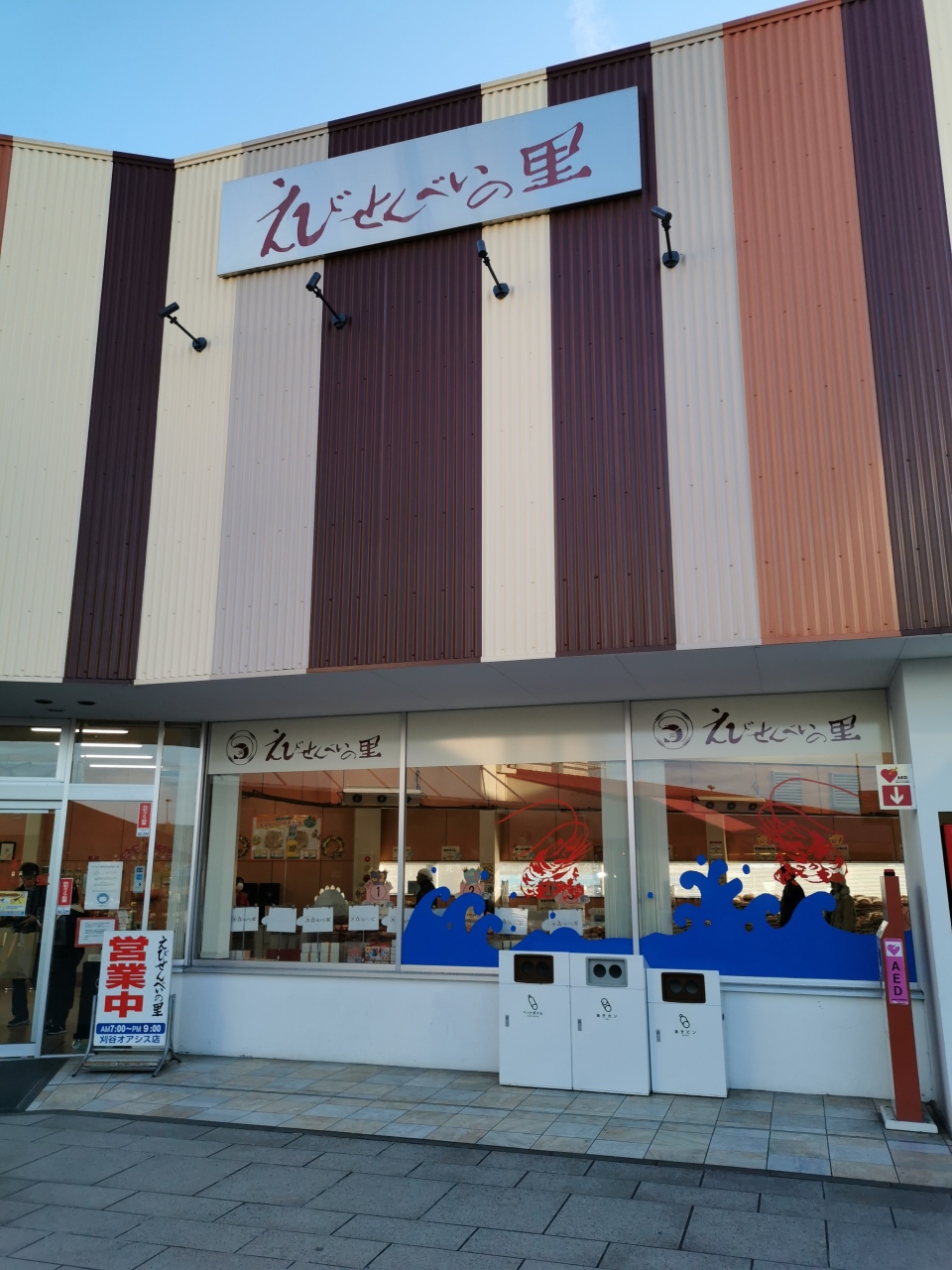 観覧車が目立つ刈谷ハイウェイオアシスにある「えびせんべいの里 刈谷オアシス店」です。有名な超豪華トイレの前にお店があります。店内はお土産を求める観光客が多数かと思ったらコロナのせいか閑散。店内は多数の試食ができるので購入する前に満足してしまいます。