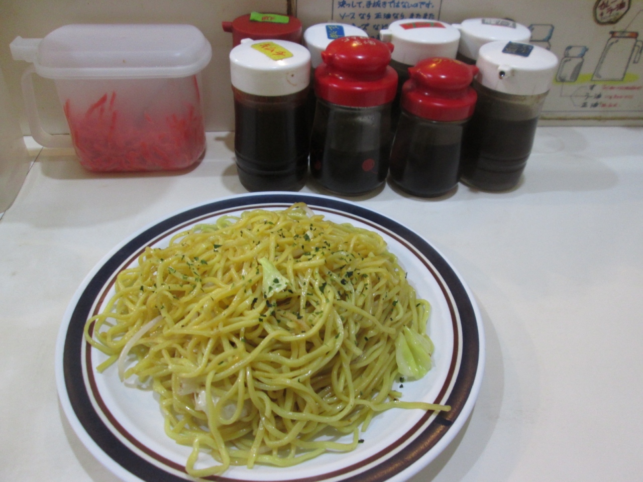 出て来るやきそばに味付けはないので、テーブル上にある数種類のソースやマヨネーズで自分好みの味付けをします。
