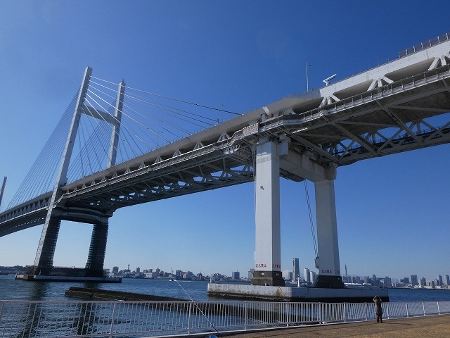 新型肺炎の船内感染で大騒ぎになっている豪華客船が停泊する大黒ふ頭。遠くフェンス越しに客船を眺めていて、ふと後ろを振り向くと、そこには横浜ベイブリッジ。大黒ふ頭のPAから見たり、実際に何度も走っているけど、下から見たのは初めてでした。一つ驚いたのは、ベイブリッジが走る首都高湾岸線の下に国道357号の橋があったこと。以前はベイブリッジが歩けましたけど、ここの歩道のことだったんですね。今は車だけ。湾岸線は横浜に入ると、妙に車が減るイメージだけど、無料の道路があるから高額な湾岸線を無理して走ることないってことかしら。