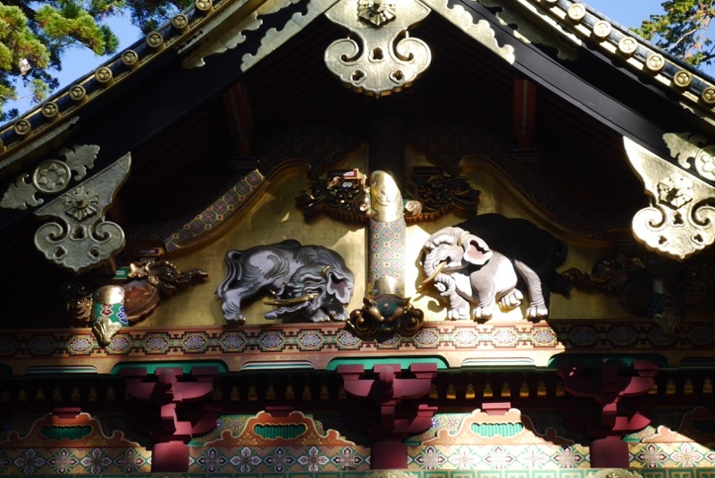 日光東照宮内へ入って…三猿のところに人が集まっているからすこしほかのところにも目を向けてみようか、と反対あたりを向いたら目にとびこんできた象です。日本よりももっと西から来たような雰囲気の象の像です。正式名が想像の象、ということは想像の象の像…ということで、すこしおもしろいネーミングですね。