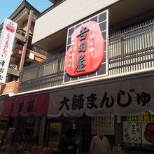 川崎大師の大山門前に広がる仲見世通りにお店がありました。仲見世通りの真ん中あたりでした。仲見世通りではたくさんのだるまが並んでいるお店も多いですが、こちらではだるま型のおせんべいが並んでいました。またおまんじゅうなどもありました。