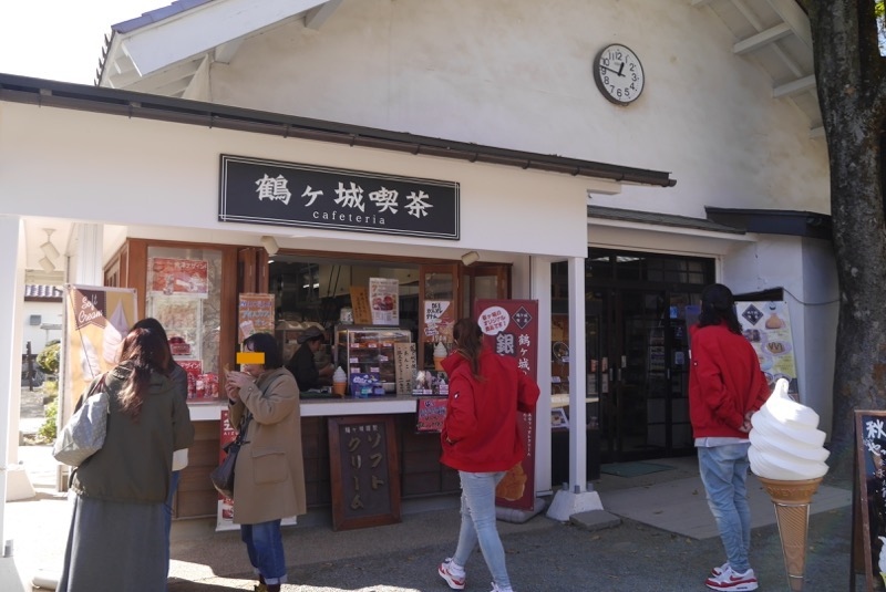 鶴ヶ城観光案内所の横にある軽食を販売しているお店です。立ち寄りやすい立地にあり、また、ソフトクリームから揚げ物などなど、軽食といえども販売している商品のラインナップが幅広いのでなにがしかは自分の食べたいものに近しいものに出会えることかと思います。訪れたときはそんなに寒くなかったので、ソフトクリームをいただきました。