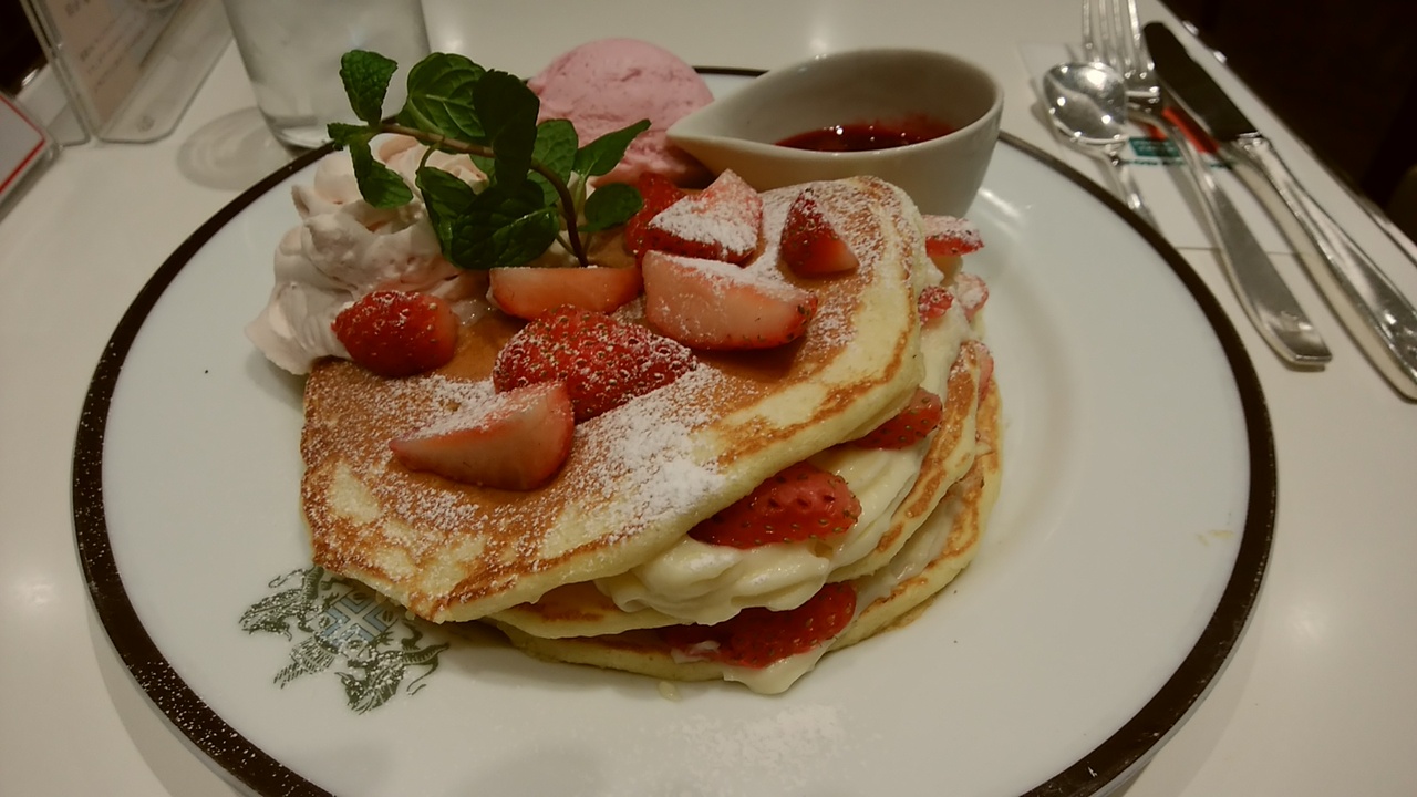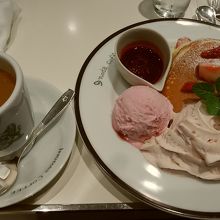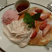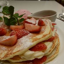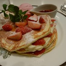 この季節苺メニューが出てて気になってたので、すぐにイチゴのパンケーキに決めました。期待通りで見た目もお味も華やかでした。クリームもそれ程甘くなく最後まで美味しくいただけました!