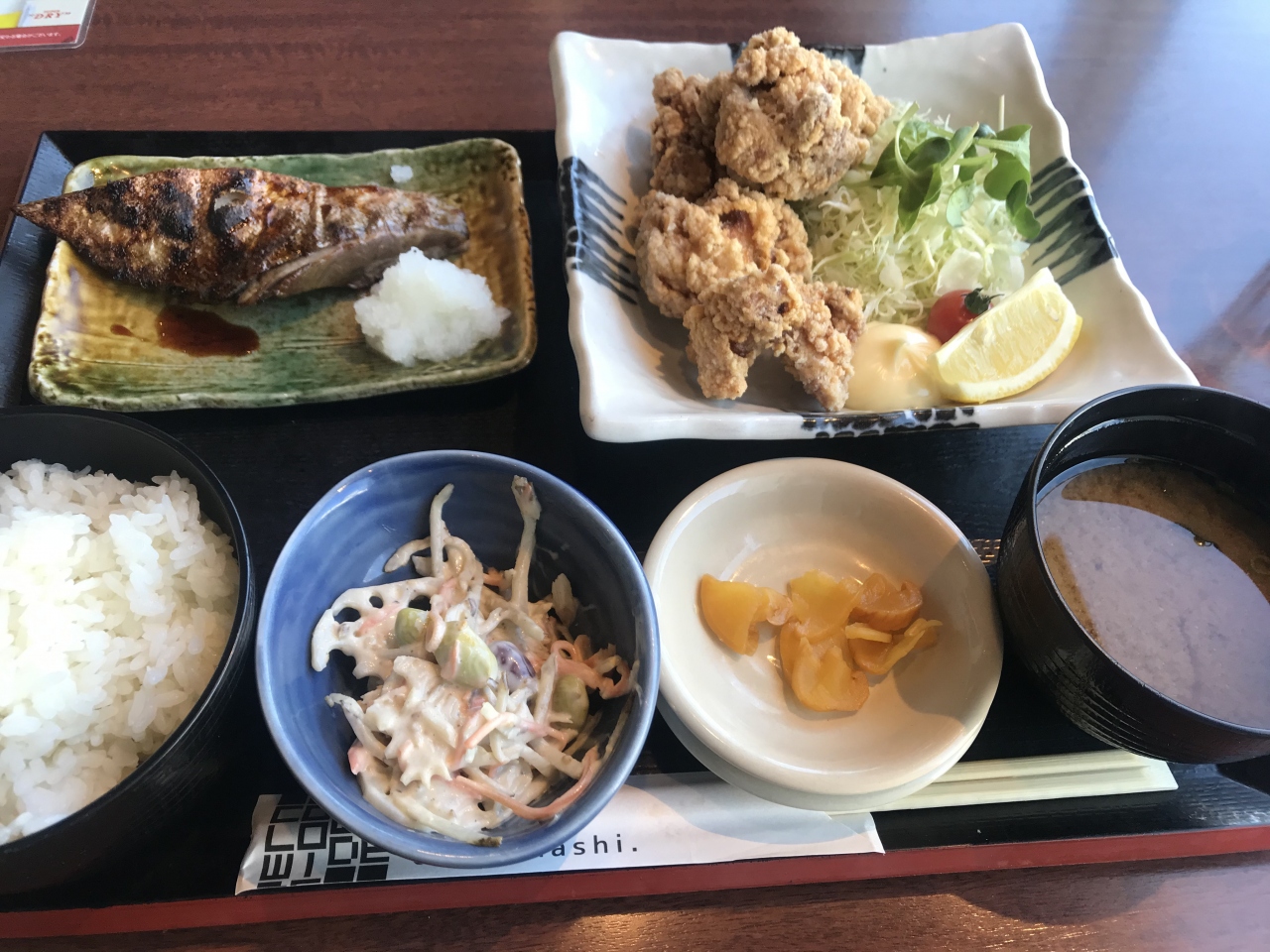 休日専用のランチメニューから、ざんぎ(とりの唐揚)とブリの照焼の定食をいただきました。