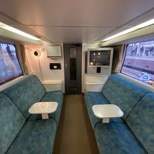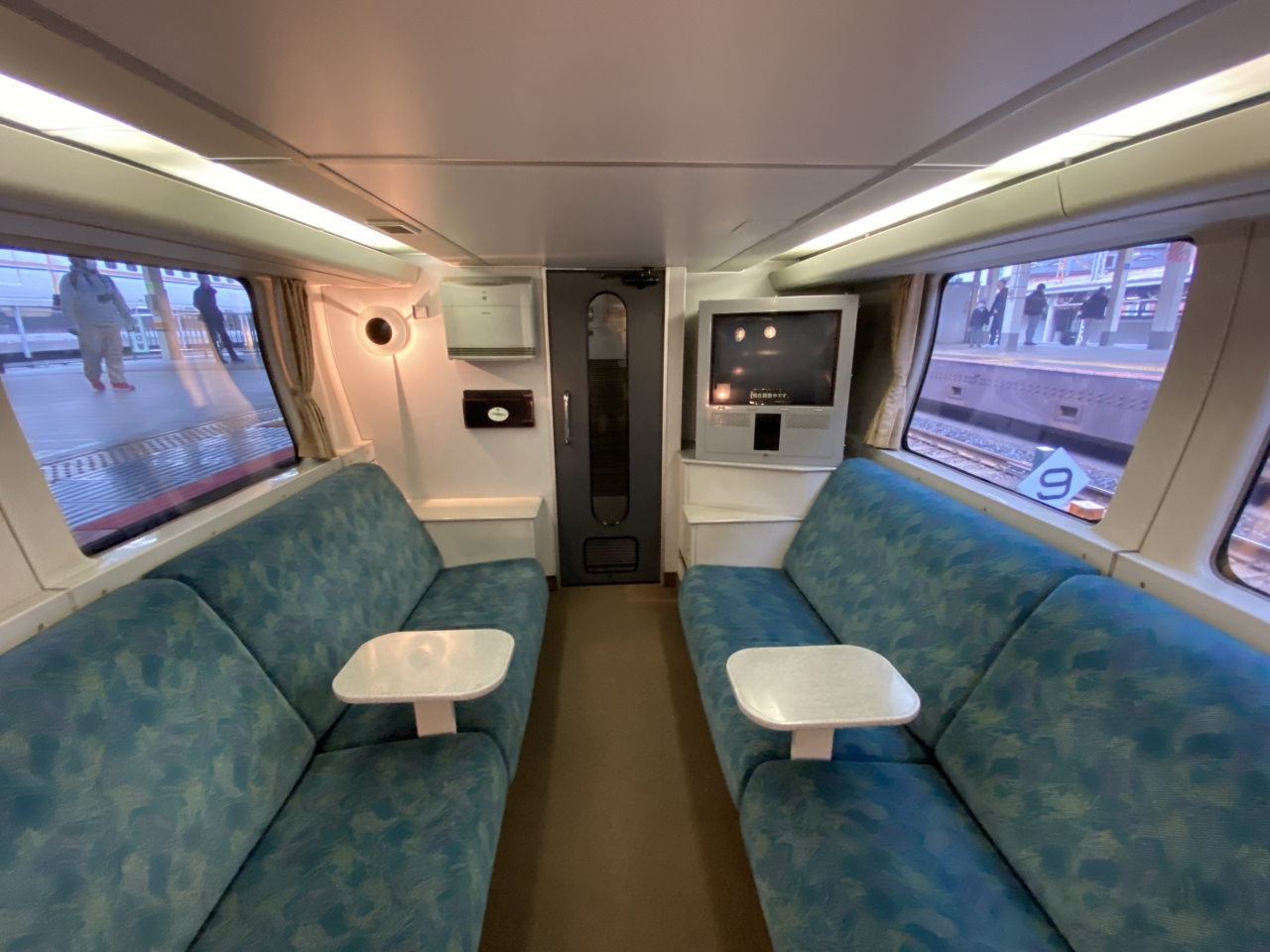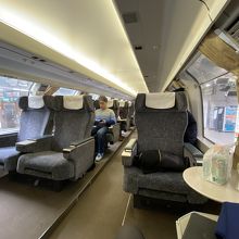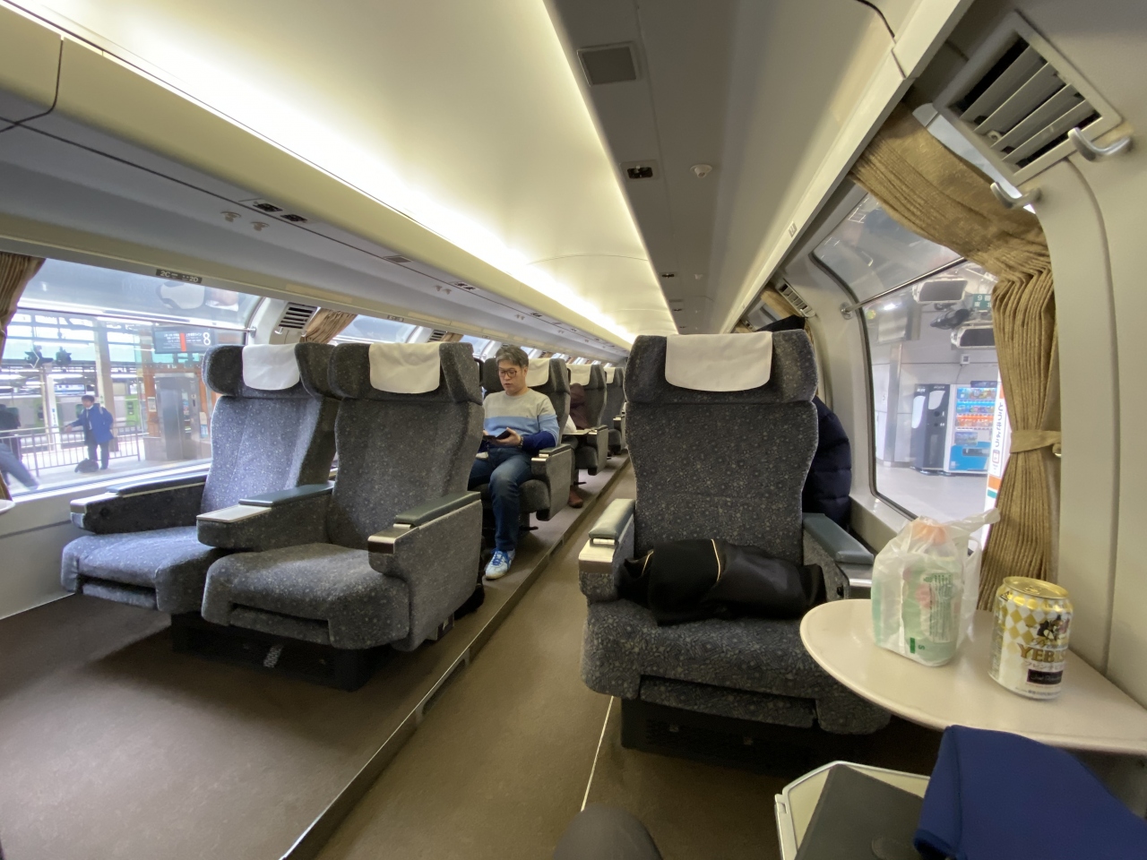 グリーン車では飲み物のサービスがあります。1号車の1階はサロンになっていて用意のいい方たちが団体で宴会始めてしまうことも。